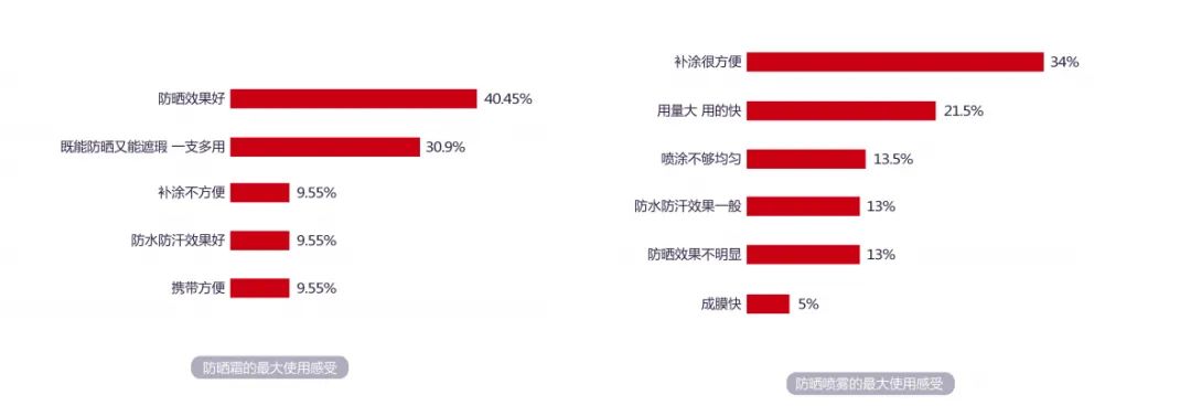 對(duì)于防曬霜和防曬噴霧的使用感受,消費(fèi)者也有不同側(cè)重點(diǎn)。40.45%的消費(fèi)者認(rèn)為防曬霜的果好,34%的消費(fèi)者認(rèn)為防曬噴霧補(bǔ)涂方便。