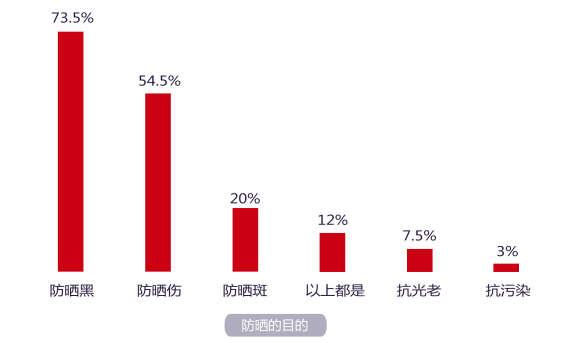 值得一提的是,從使用防曬品的目的來看,73.5%的消費(fèi)者主要希望防曬黑,其次是防曬傷,僅7.5%的人希望通過防曬抗光老化。同時(shí),僅有不足3成的消費(fèi)者有全年使用防曬產(chǎn)品的習(xí)慣。