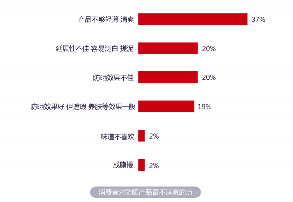報(bào)告顯示,對(duì)防曬產(chǎn)品不滿意的消費(fèi)者中,37%的認(rèn)為防曬產(chǎn)品不夠輕薄、清爽,同時(shí)BA們收到的客訴也包含了這一點(diǎn),52.5%的BA反映顧客認(rèn)為防曬產(chǎn)品不夠清透,有厚重感或容易悶痘。如今的消費(fèi)者崇尚打造“零負(fù)擔(dān)”的妝容,輕薄透氣、不油膩的防曬產(chǎn)品,或?qū)⒏呤袌?chǎng)潛力。