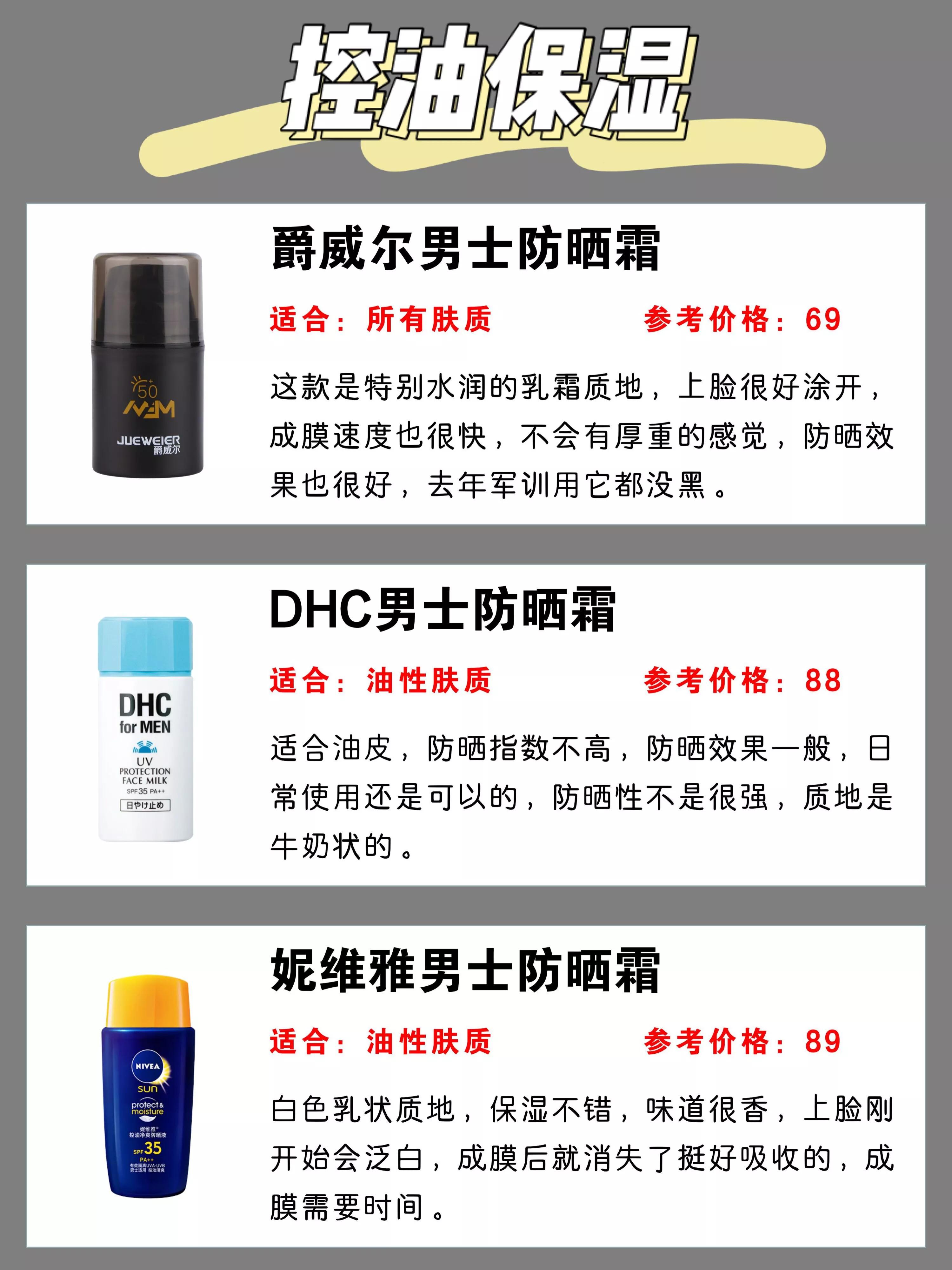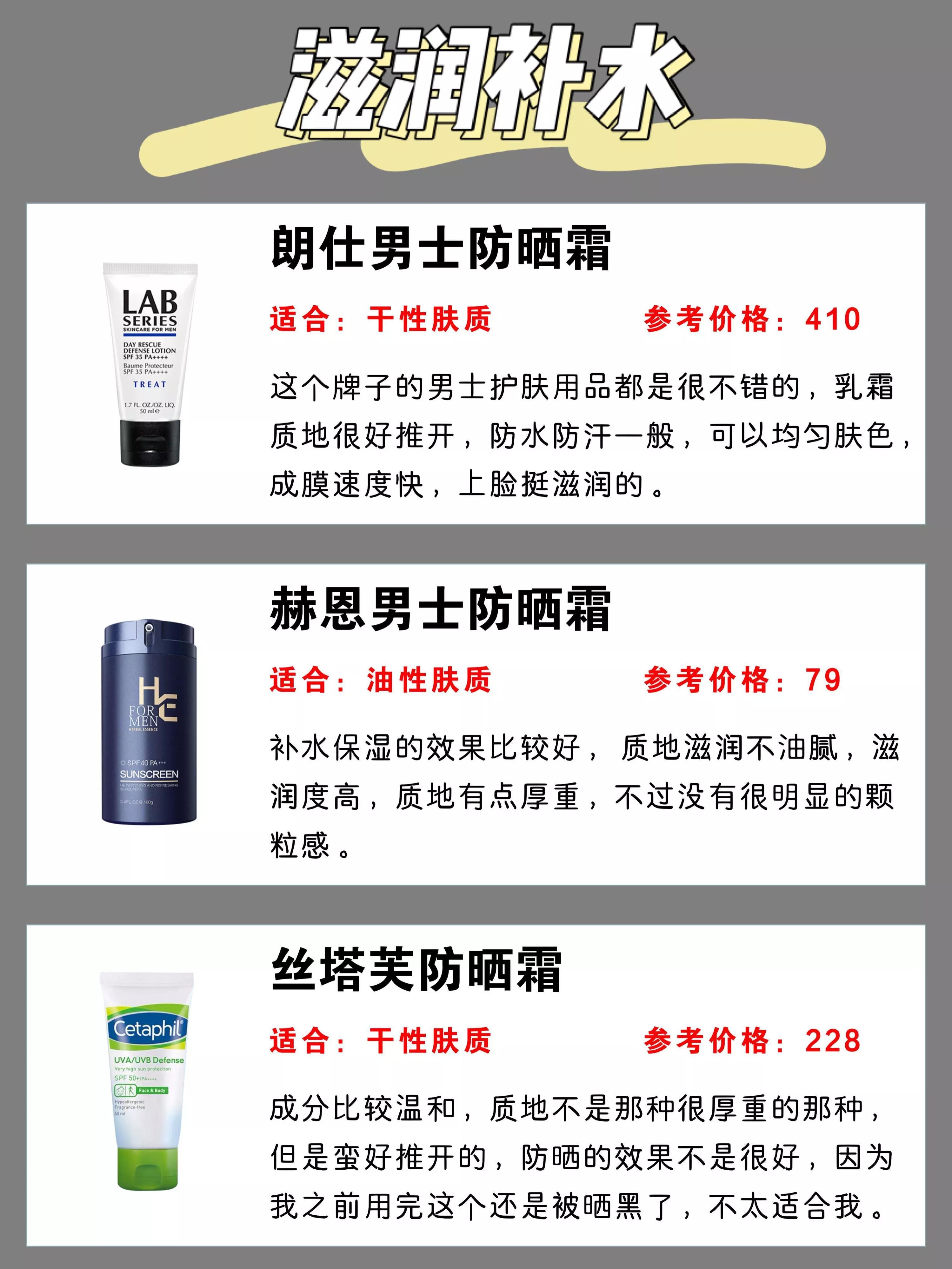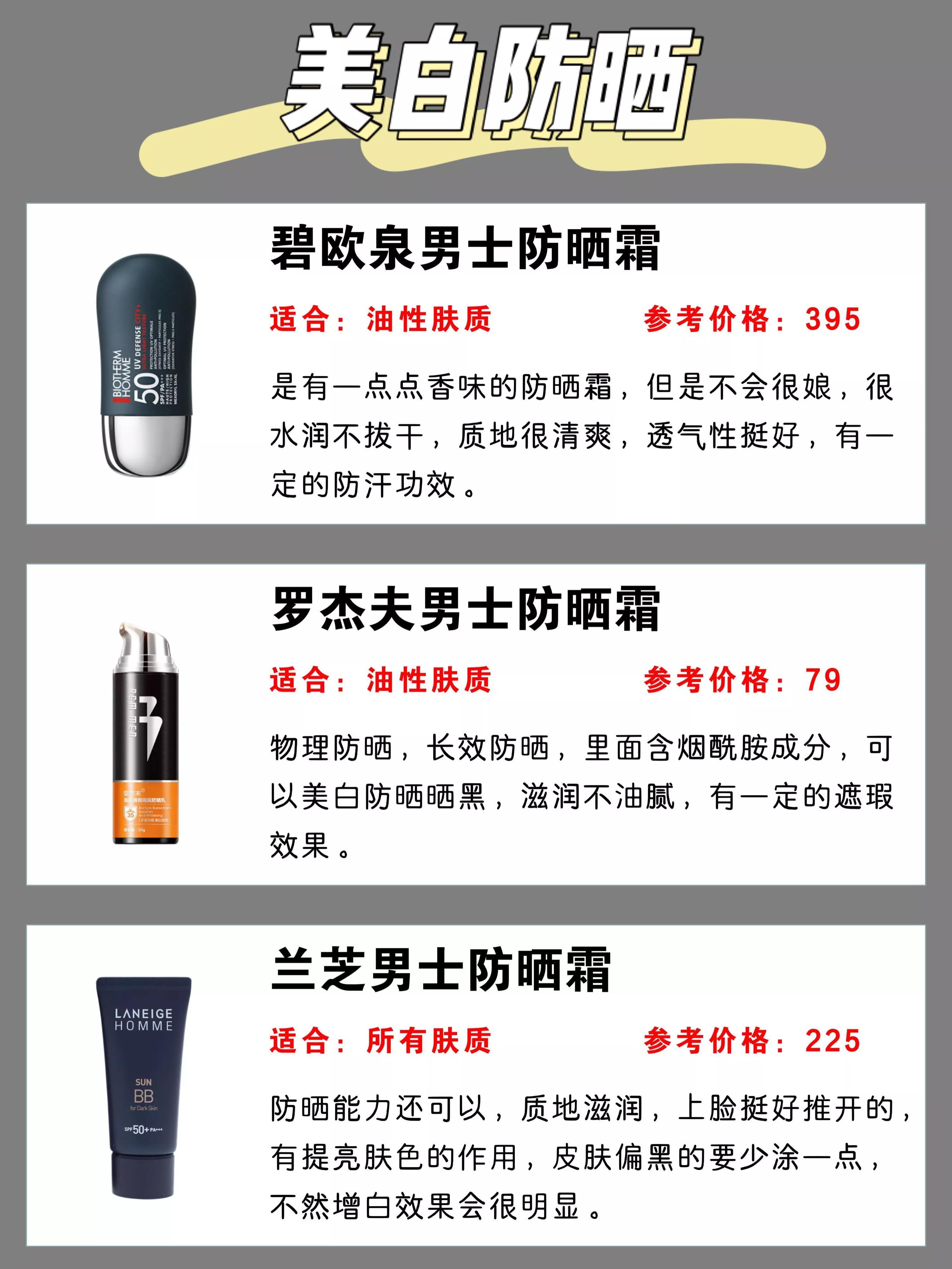 1、LISSAGE MEN防曬霜。嘉娜寶旗下的男士護(hù)膚品牌,乳液質(zhì)地,采用ADVAN深度紫外線損傷屏障技術(shù),讓防曬涂抹見均勻分布于皮膚上,同時讓霜體質(zhì)地更細(xì)膩,透明度更高,清爽,不泛白,不黏膩。物化型防曬,添加蘆薈提取物、西梅提取物、綠茶提取等多種植物精華;另外,清新香味也來自100%天然精油,并不含香精,不含礦物油,完全不擔(dān)心致痘。2、paul stuart 防曬霜(防水)。這牌子國內(nèi)比較陌生,高絲的男士護(hù)理品牌,針對男士戶外活動多的特點,擁有高防護(hù)值,和強(qiáng)的防水防汗力,無論什么場景,時刻保護(hù)皮膚免受強(qiáng)紫外線的傷害,同時防止暴露年齡的斑點。分層的涂改液質(zhì)地,質(zhì)地清爽不泛白,清新舒適的使用感。添加男士護(hù)膚成分:橡木提取物、綠茶提取物、茴香提取物等;不用卸,潔面膏就能洗掉,微香型的清新柑橘味。