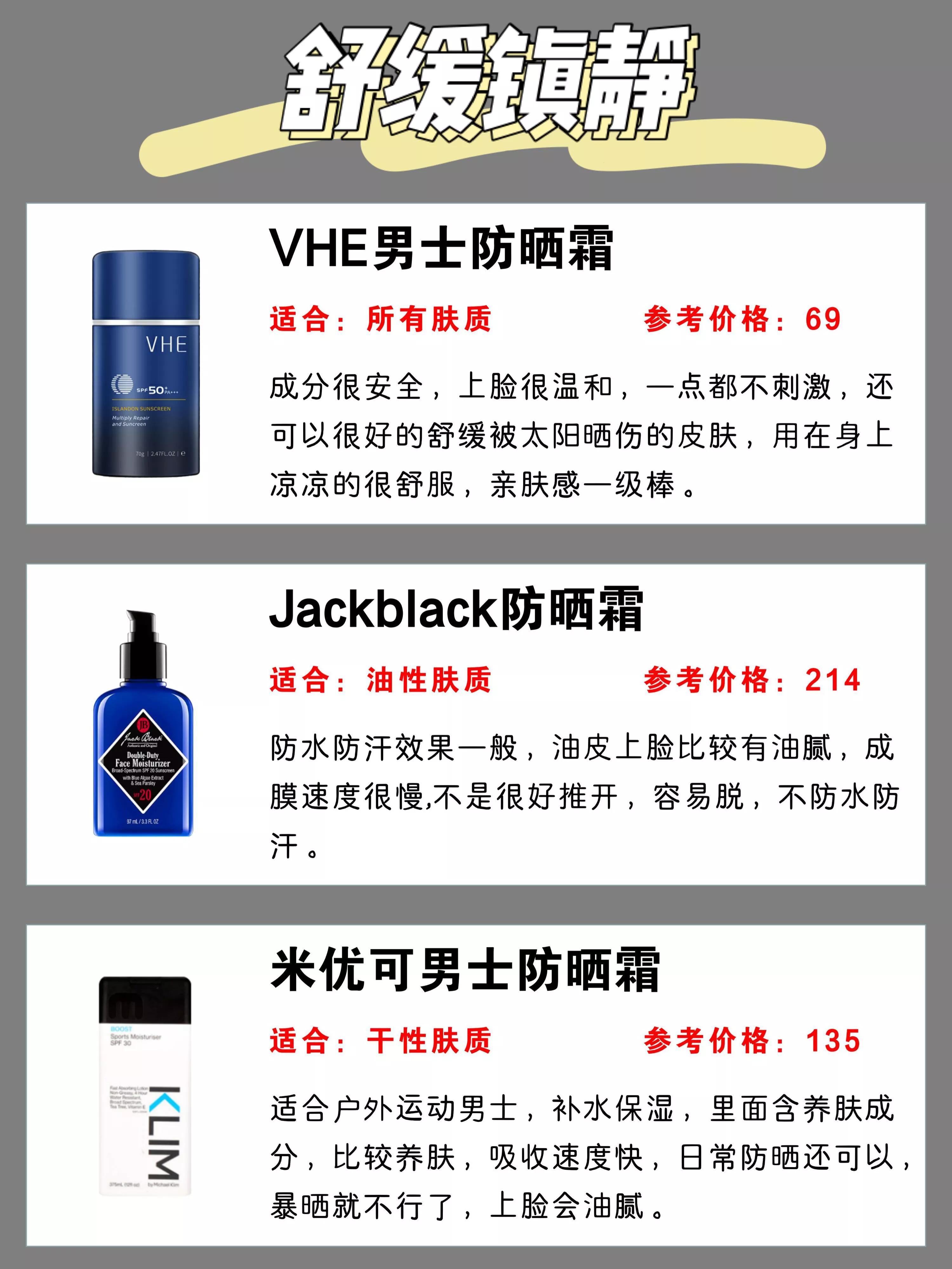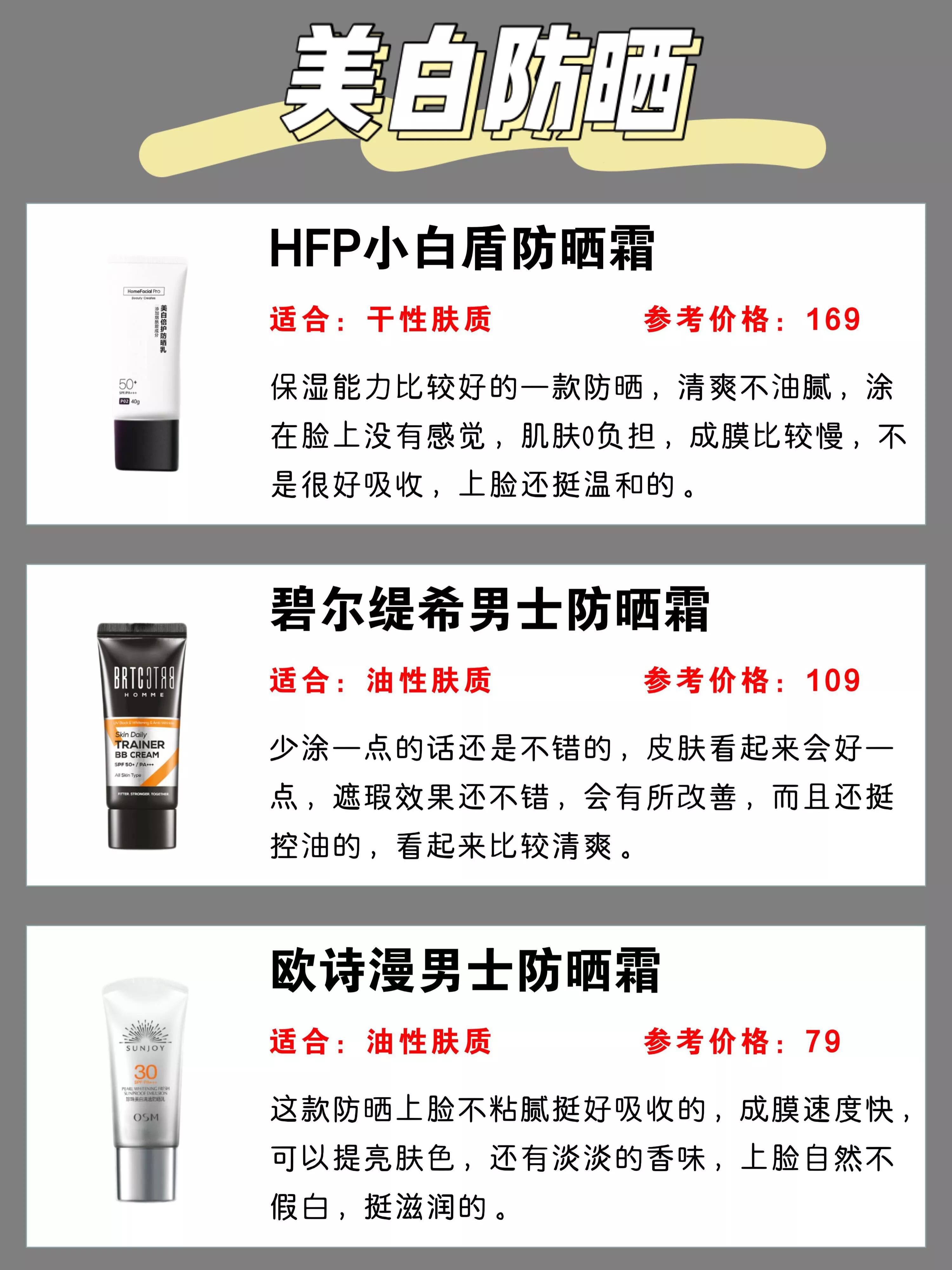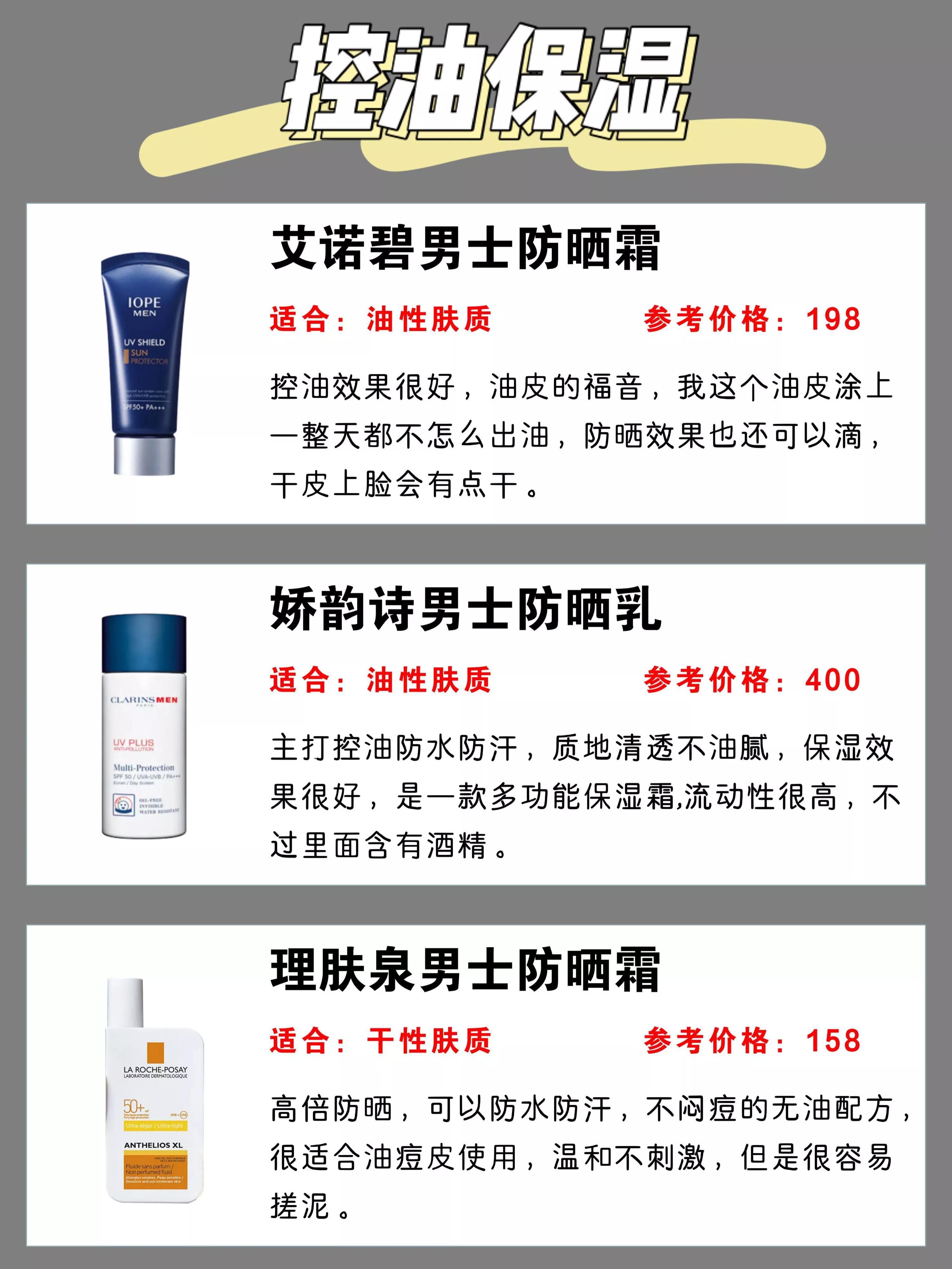 1、LISSAGE MEN防曬霜。嘉娜寶旗下的男士護(hù)膚品牌,乳液質(zhì)地,采用ADVAN深度紫外線損傷屏障技術(shù),讓防曬涂抹見均勻分布于皮膚上,同時讓霜體質(zhì)地更細(xì)膩,透明度更高,清爽,不泛白,不黏膩。物化型防曬,添加蘆薈提取物、西梅提取物、綠茶提取等多種植物精華;另外,清新香味也來自100%天然精油,并不含香精,不含礦物油,完全不擔(dān)心致痘。2、paul stuart 防曬霜(防水)。這牌子國內(nèi)比較陌生,高絲的男士護(hù)理品牌,針對男士戶外活動多的特點,擁有高防護(hù)值,和強(qiáng)的防水防汗力,無論什么場景,時刻保護(hù)皮膚免受強(qiáng)紫外線的傷害,同時防止暴露年齡的斑點。分層的涂改液質(zhì)地,質(zhì)地清爽不泛白,清新舒適的使用感。添加男士護(hù)膚成分:橡木提取物、綠茶提取物、茴香提取物等;不用卸,潔面膏就能洗掉,微香型的清新柑橘味。