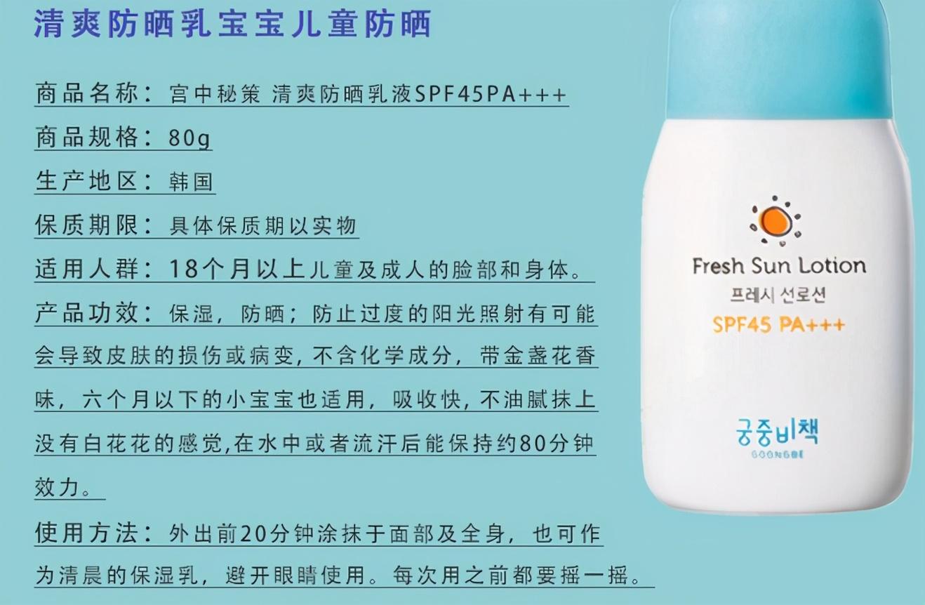 兒童專用的防曬霜往往都經(jīng)過嚴格的測試因為兒童的皮膚比大人的更加敏感脆弱所以需要成分更溫和健康的防曬這樣寶寶使用也更放心韓國宮中秘策GOONGBE兒童防曬霜宮中秘策是專門做寶寶產(chǎn)品的寶媽必備~