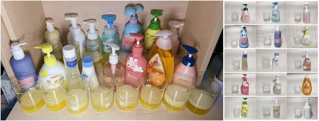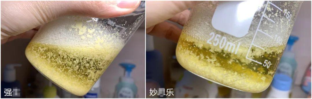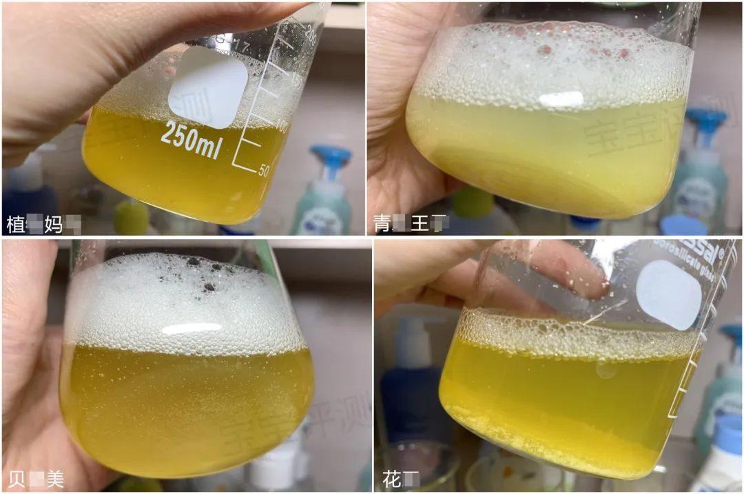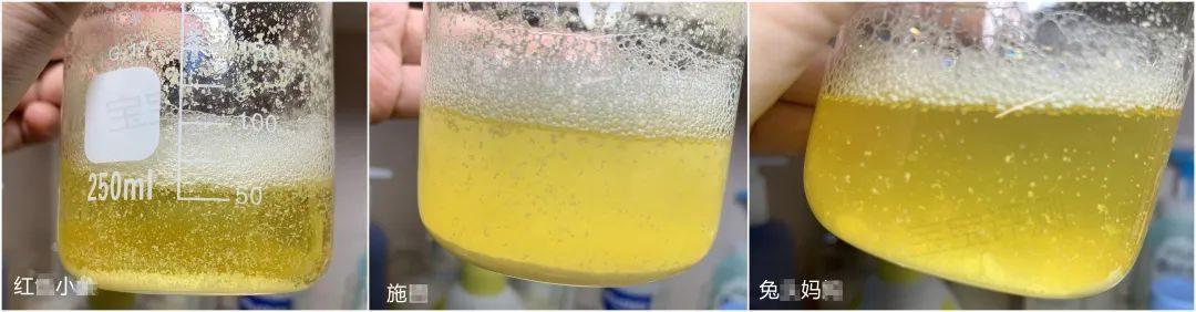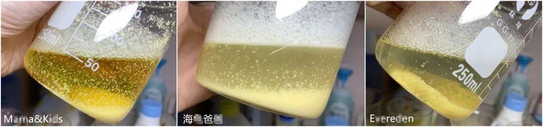 其他6款兒童洗發(fā)水,玉米醇溶蛋白保留了一部分沉淀,溶解了一部分。