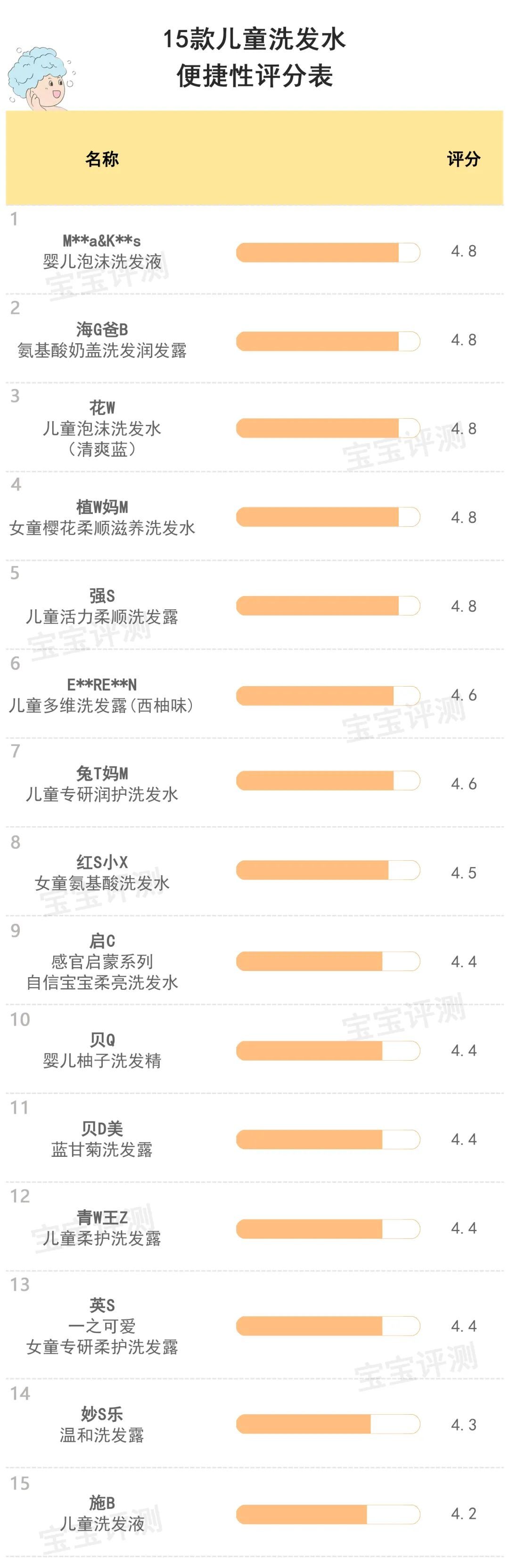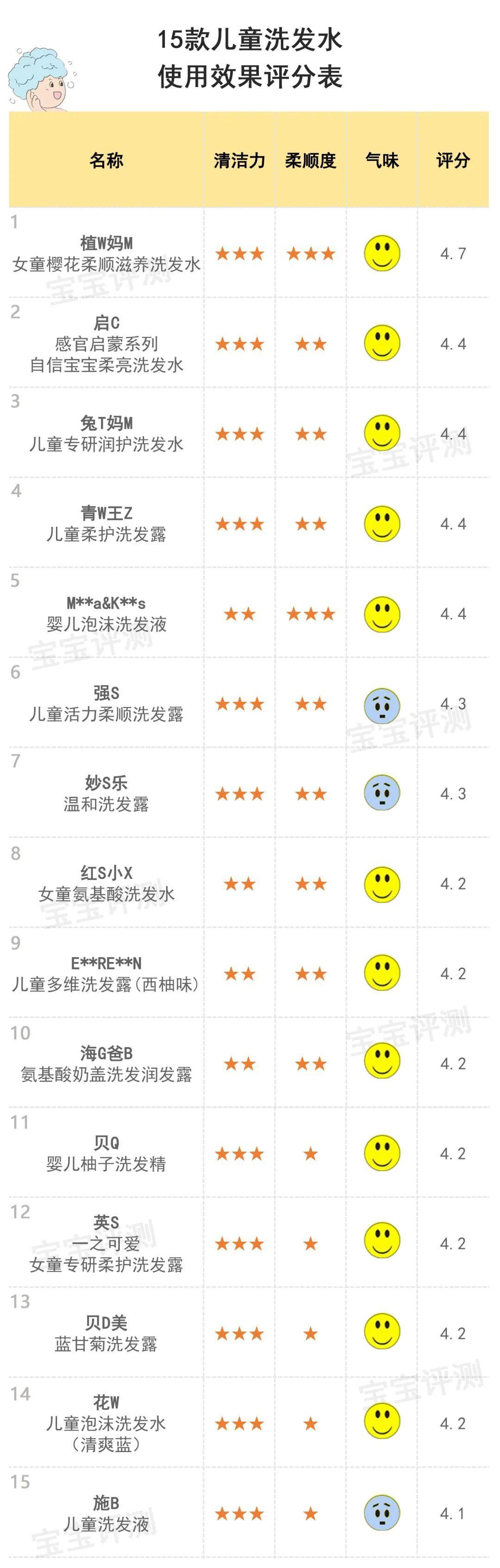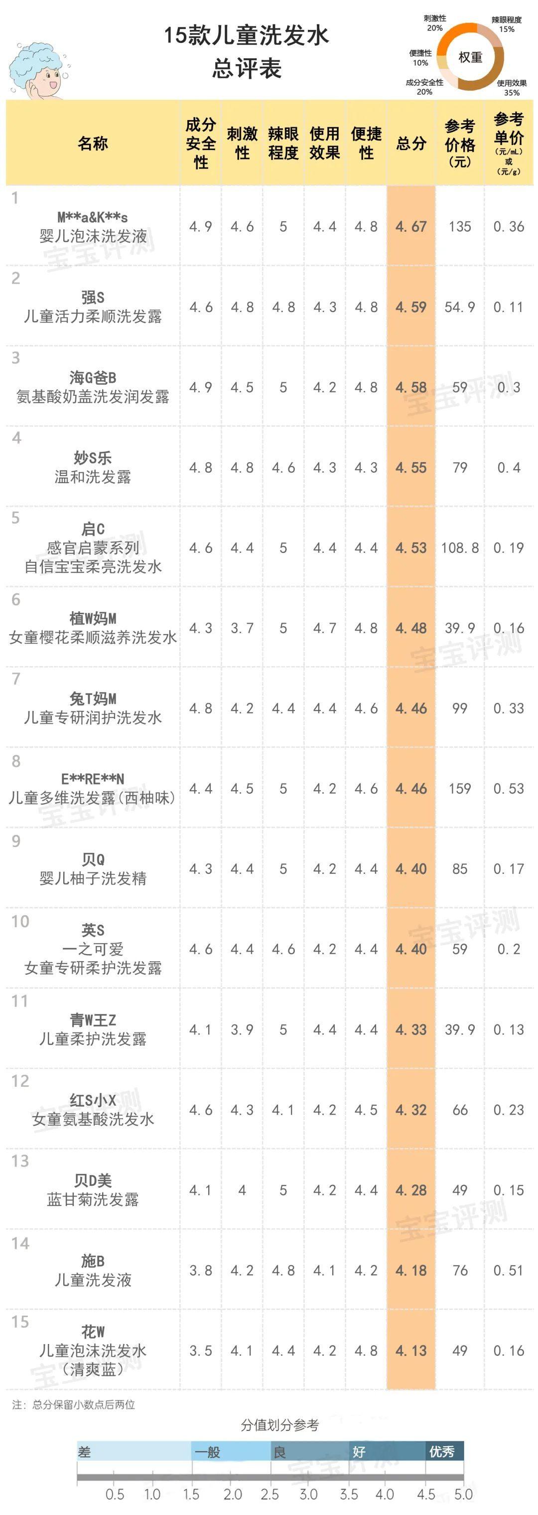 總評及綜合推薦綜合以上幾項評測結(jié)果,為給大家提供一個相對比較直觀的參考,笨爸爸對15款兒童洗發(fā)水進行了評分及排名: