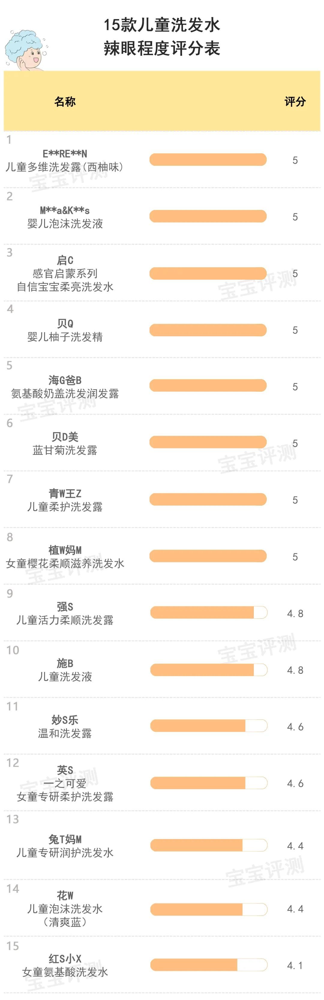 綜合以上分析,15款兒童洗發(fā)水笨爸爸給出的辣眼程度評分情況如下: