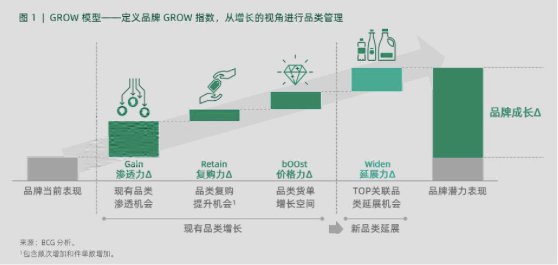 我注意到波士頓和天貓大快消今年提出了一個“Grow”增長模型。Grow是由4個英文單詞組成,分別是:Gain(指現(xiàn)有品類滲透機(jī)會)、Retain(品類復(fù)購提升機(jī)會)、bOOst(品類貨單增長空間)和Widen(關(guān)聯(lián)品類延展機(jī)會)。