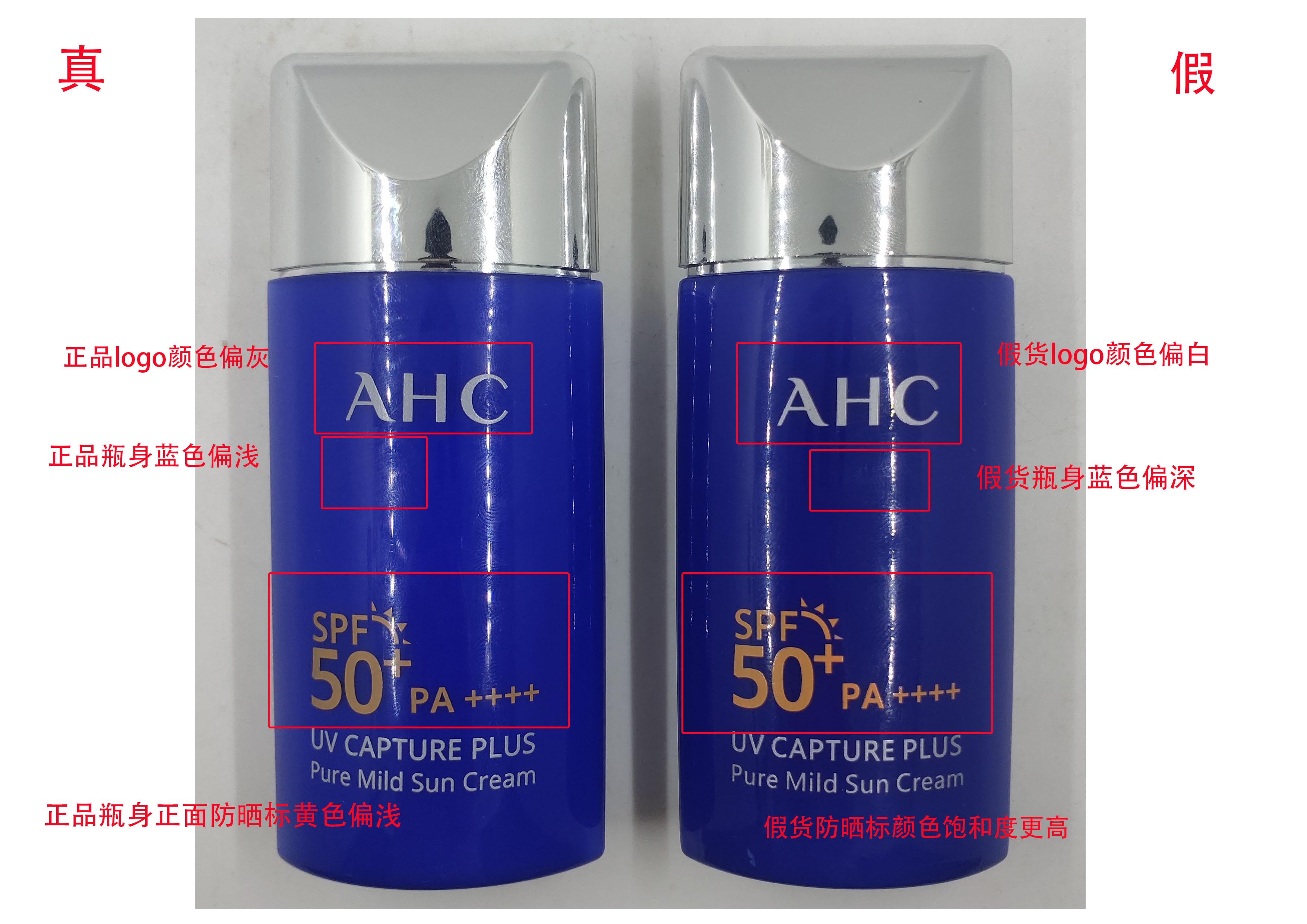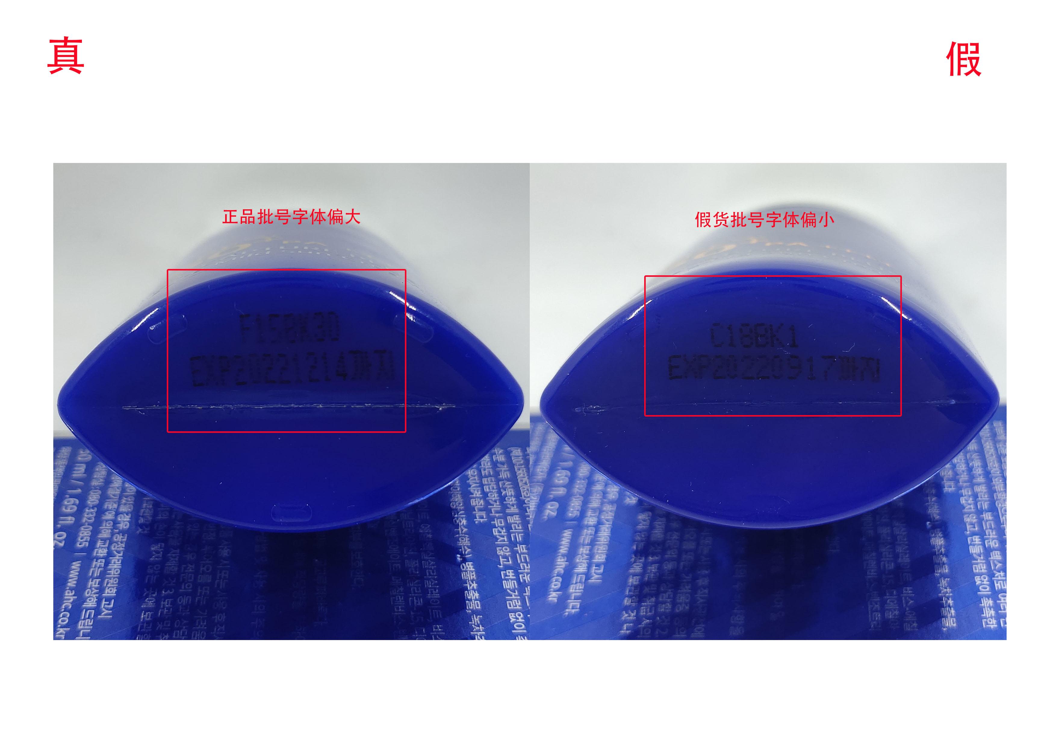 假貨logo顏色偏白,瓶身藍(lán)色偏深,防曬標(biāo)顏色飽和度更高