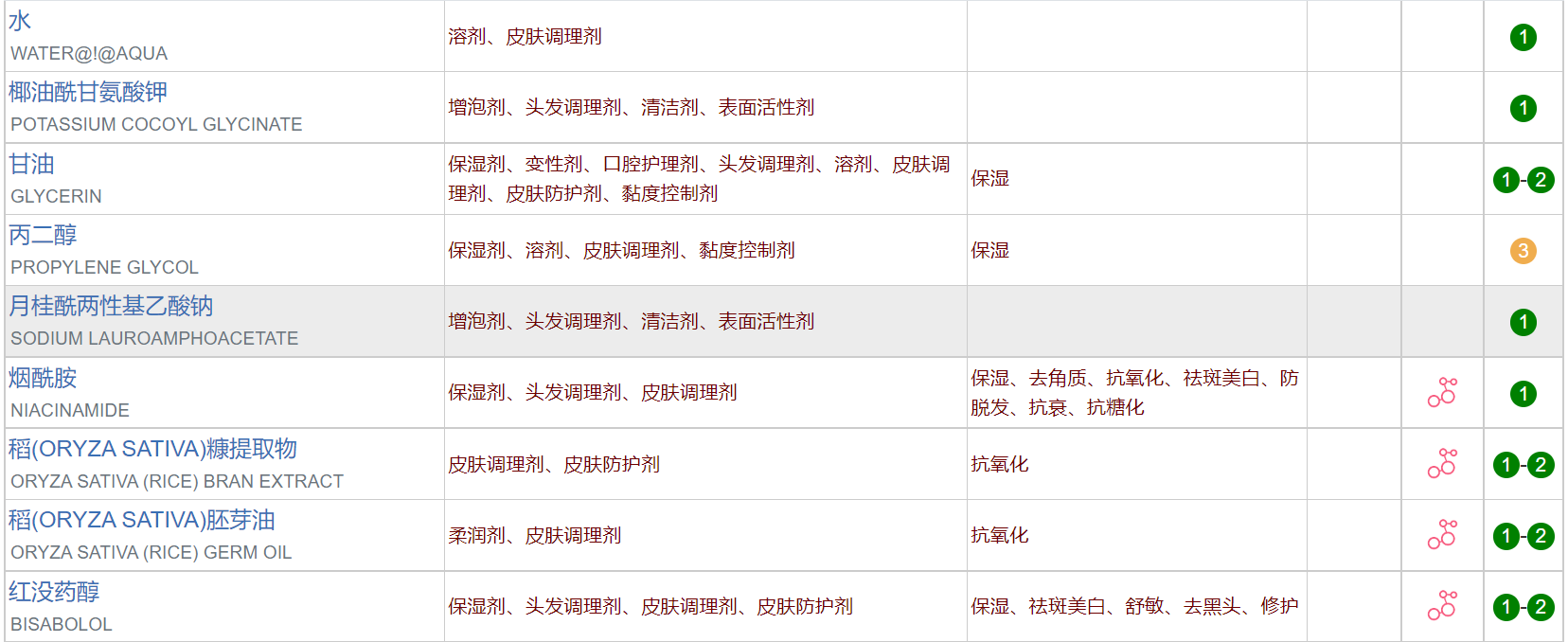 成分方面,基本上和旁氏米粹差不多,都是椰油酰甘氨酸鉀、月桂酰兩性基乙酸鈉的表面活性劑,不過添加的各種植物成分沒有米粹多,但個人覺得這個香味更好聞一些。度也有四顆星,只要不是特別敏感的皮膚,用起來無壓力。