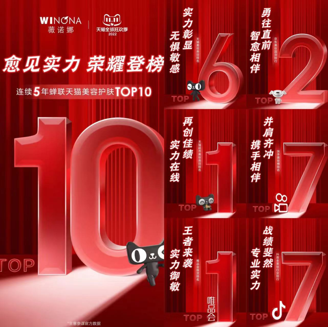 在剛剛結(jié)束的雙11,薇諾娜位居天貓美妝類(lèi)目排名TOP6,并且連續(xù)5年蟬聯(lián)天貓美容護(hù)膚TOP10。同時(shí),薇諾娜雙11全網(wǎng)的成績(jī)也十分出彩,唯品會(huì)TOP1、京東TOP2、快手、抖音平臺(tái)TOP7。