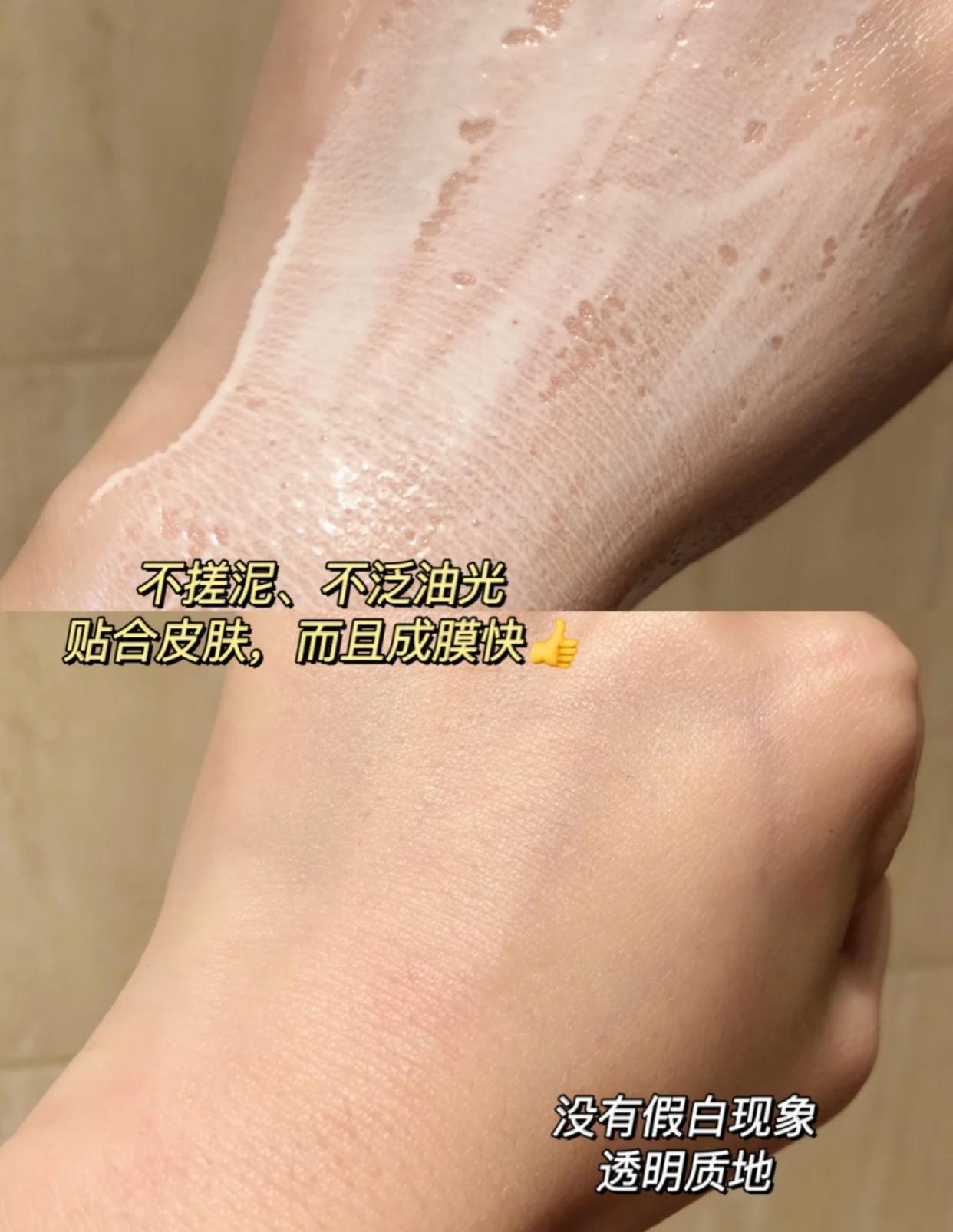 其次質(zhì)地比較滋潤,30s左右就能成膜,不過因?yàn)槭羌兓瘜W(xué)防曬,不太適合敏感肌,油皮用起來膚感也會偏油。
