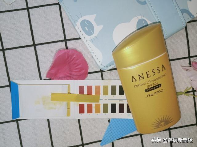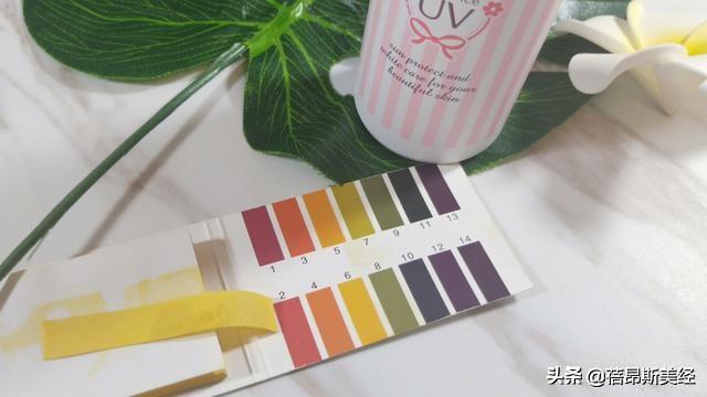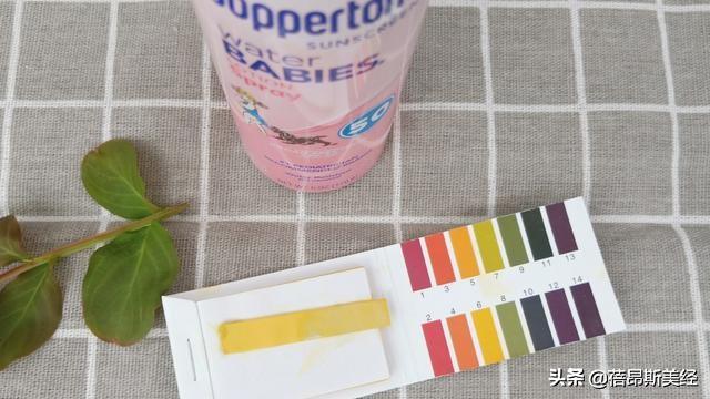 將防曬乳涂在PH試紙上,抹勻,試紙顏色由黃色變青了一點(diǎn)點(diǎn),對(duì)照色卡,可見PH值在6.5-7.0之間,弱酸性偏中性,性沒問題。