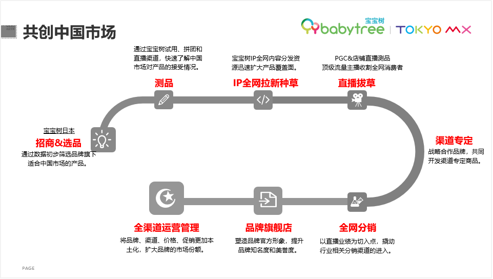 按照寶寶樹與Tokyo MX合作的EC計劃,我們可以想象:有強烈意愿進入中國市場的日本品牌,愿意和寶寶樹一起共同打開中國市場,那么踏出的第一步就是把它們的優(yōu)質(zhì)商品提供給寶寶樹即可。寶寶樹會結(jié)合數(shù)據(jù)進行初步篩選,快速測試中國用戶和渠道對產(chǎn)品的接受程度,再利用寶寶樹全域流量的分發(fā),根據(jù)品牌及用戶口碑,一起合作渠道專定SKU,包括淘寶、微信、新零售、社群電商等主要渠道進行全網(wǎng)分銷。邏輯鏈很,我們拭目以待。