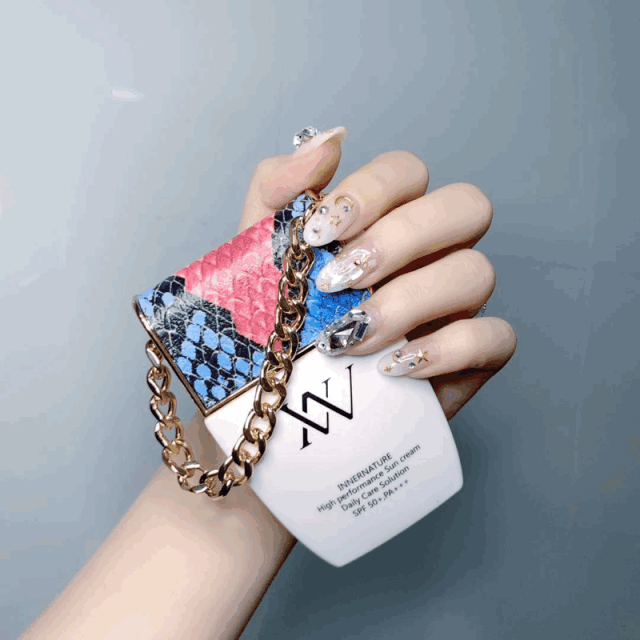 防曬霜的外觀被設(shè)計(jì)成精致的包包,瓶蓋的配色采用高級(jí)黑+典雅藍(lán)+復(fù)古紅,顏色碰撞后竟然格外和諧,另外,鎏金色的細(xì)鏈條質(zhì)感十足,拿在手里,你就是整條街靚的姐妹