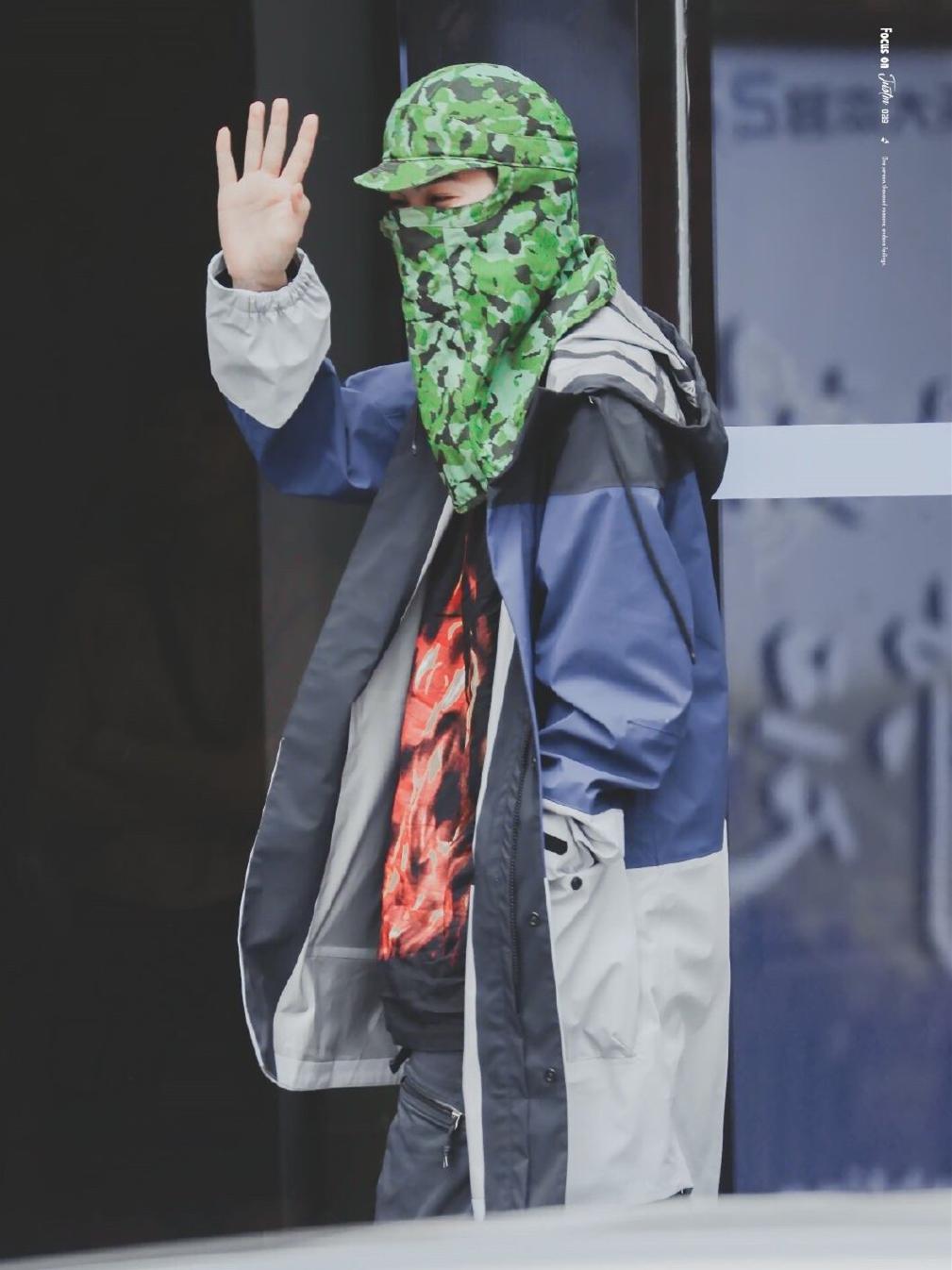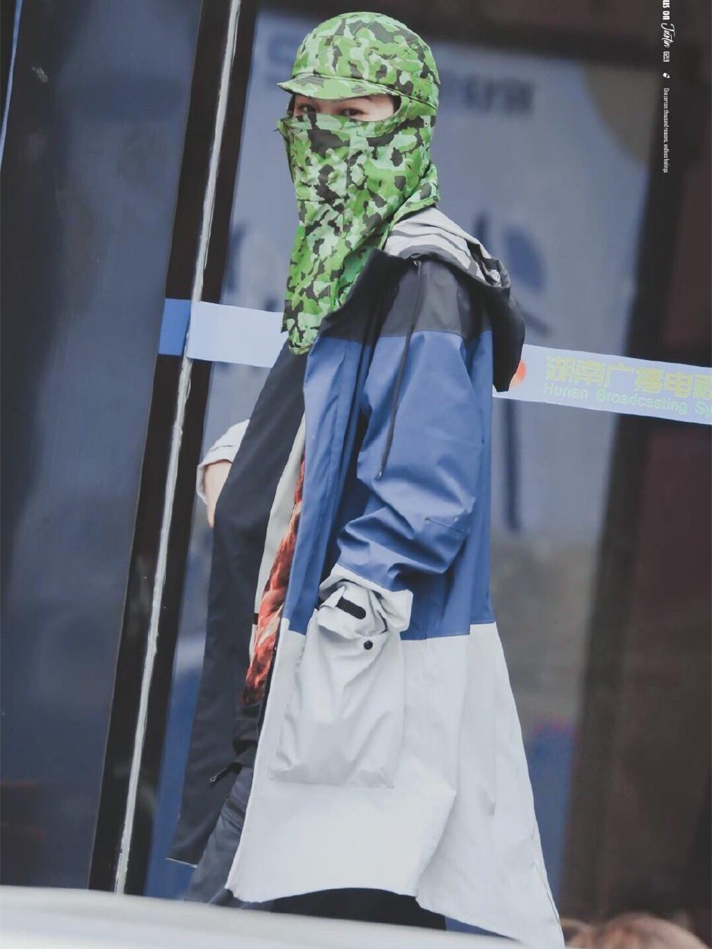 喏,就是這款連帽款的綠色迷彩頭巾,搭配上這一身沖鋒衣以及紅黑相間的衛(wèi)衣,Justin遮的可也是嚴嚴實實,只露出一雙眼睛來暗中觀察哈哈。
