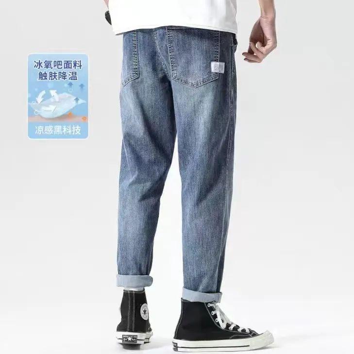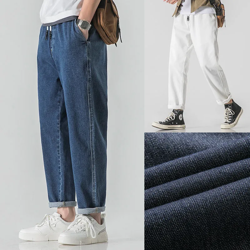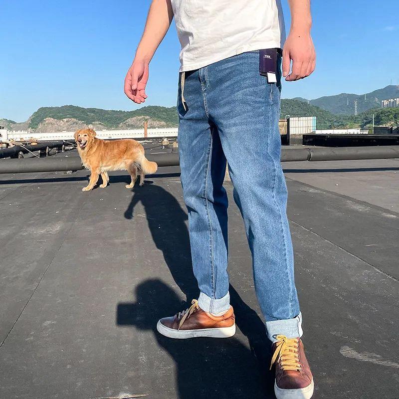 采用99%新疆棉,面料加入了萊卡纖維,使牛仔褲富有彈力且柔軟舒適。上身會比較修身一點,體型偏瘦的男士穿著果。