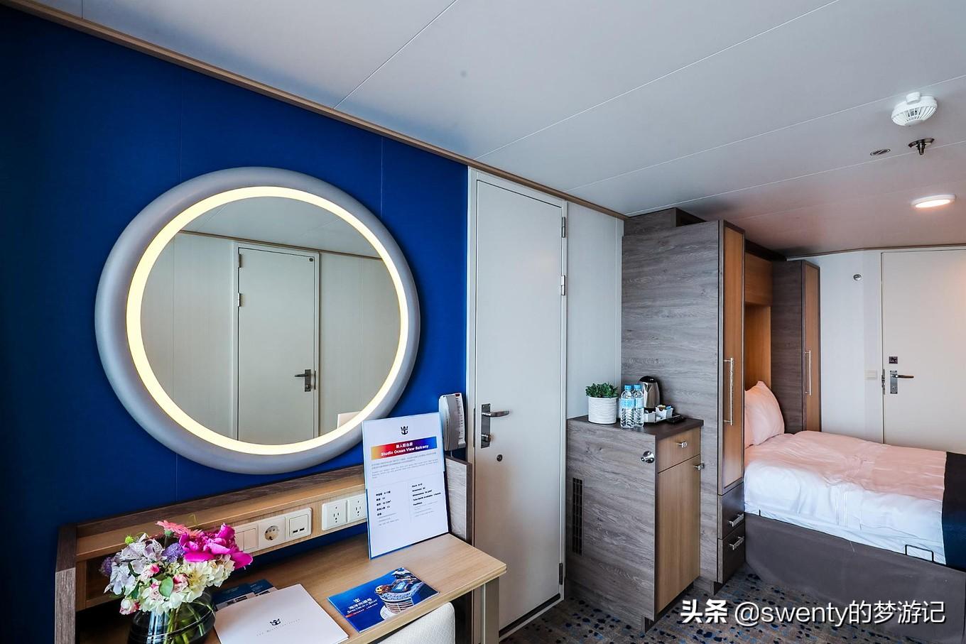 行李交給工作人員辦理托運(yùn)之后(他們會(huì)放在房間門口便捷),欣喜的兩個(gè)人很快找到了我們的房間,推門而進(jìn),卻是比想象中的更為舒適大氣,北歐極簡主義的落地?zé)?,地中海色系的家居風(fēng)格,陽臺的超棒視角,無垠開闊的海景視野,無一不體現(xiàn)著皇家加勒比的精致~