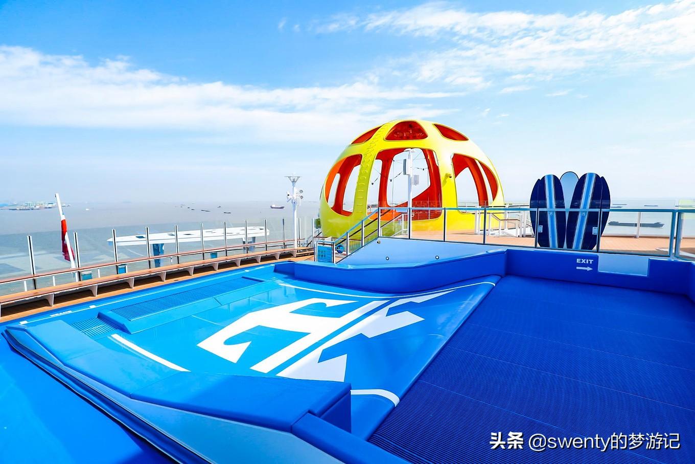 而位于15層的南極球,則與船艏北極星相對,是個(gè)直徑為11米的中空橙色球體,其靈感來源于自由落體;從北極出發(fā),穿越地心終抵達(dá)南極,在地球引力 作用下發(fā)生的物理加速與減速過程。球外是懸空玻璃步道,球內(nèi)設(shè)4個(gè)蹦極床,為大伙模擬穿越地心之旅,新鮮刺激又異常好玩,也是我跟閨蜜此行推薦的娛樂設(shè)施之一。