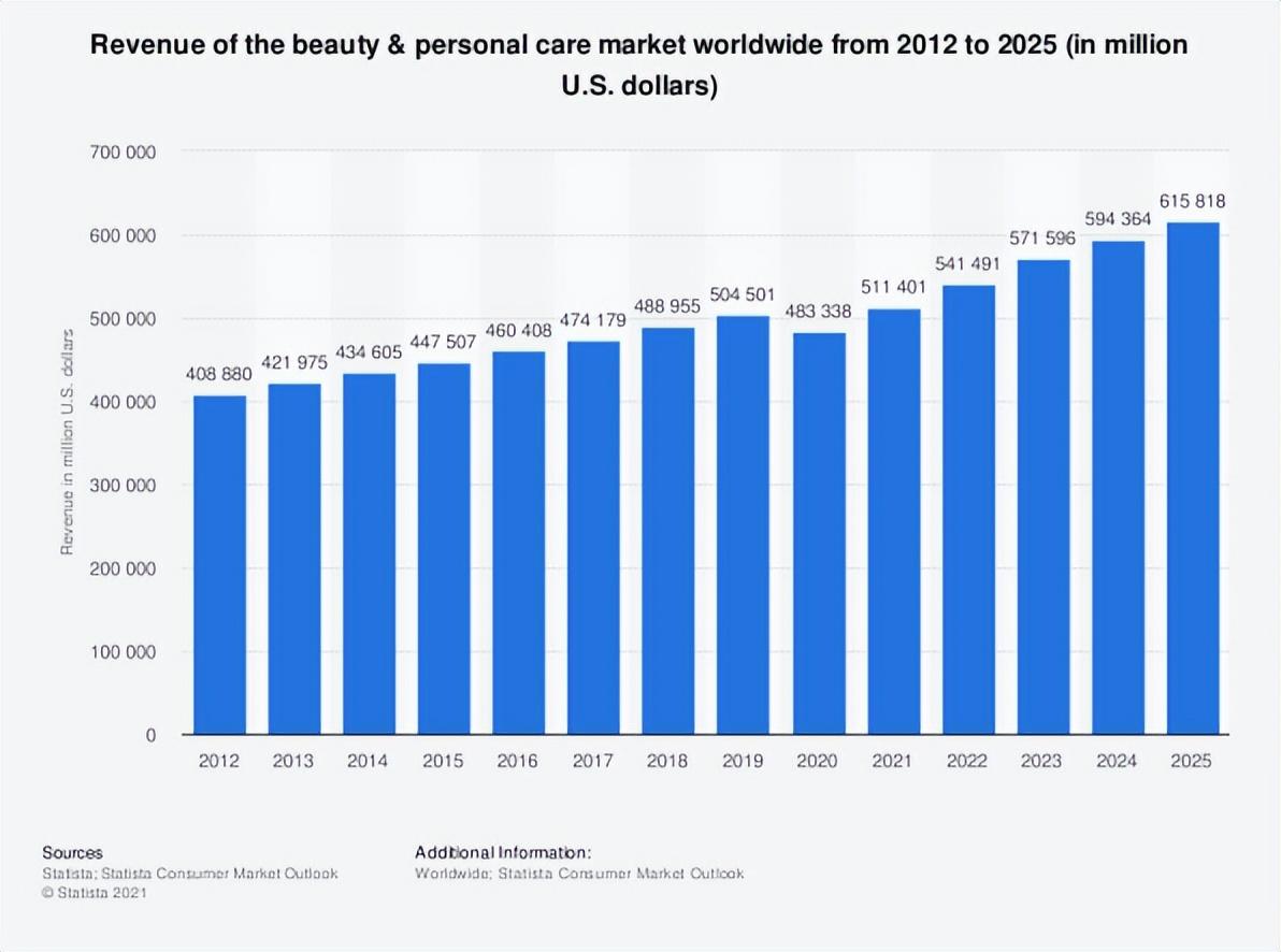 隨著顏值經(jīng)濟(jì)的發(fā)展,美妝和個(gè)護(hù)產(chǎn)品在市場(chǎng)的需求暴漲。根據(jù) Statista數(shù)據(jù)顯示,2020年美容和個(gè)護(hù)市場(chǎng)的價(jià)值超過(guò)4830億美元,預(yù)計(jì)在2025年該品類將產(chǎn)生超過(guò)6150億美元的收入。
