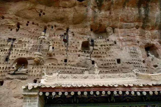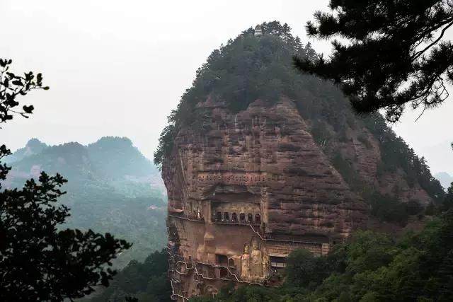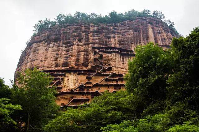 麥積山的形狀很奇特,孤峰突起,猶如麥垛。那陡崖峻壁上開鑿而成的成百上千蜂窩似的洞窟和安坐的佛像給人帶來強烈的視覺沖擊,讓人難以忘記。