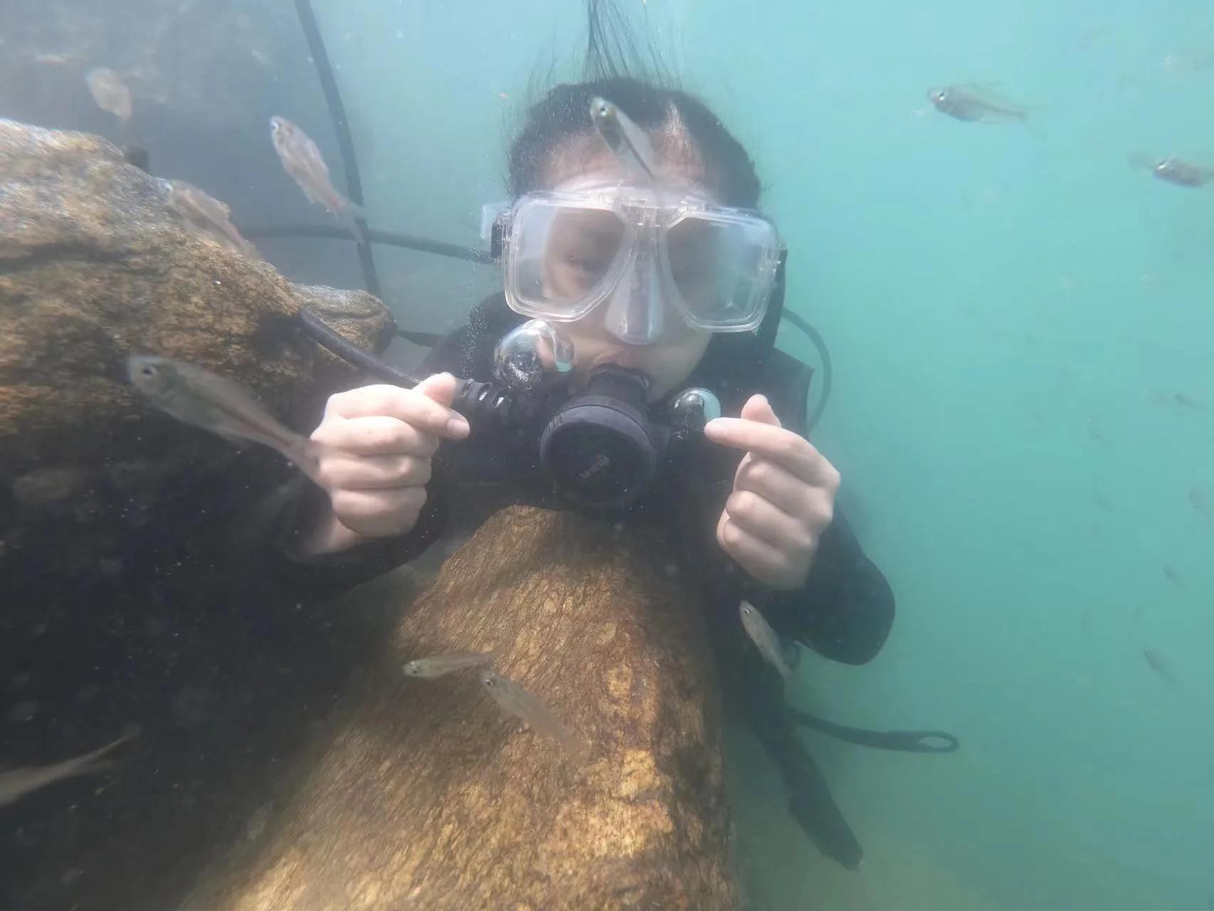 茶足飯飽后姐妹兩人直奔這次上島的主要目的地——潛水基地,客服拿出一張價格表,不同潛水項目價格各不相同,從120到998都有。因為臺風(fēng)剛剛過境,姐姐向往的外海深水潛項目暫時沒有開放,客服推薦398元的一種項目。教練細(xì)心又耐心,有經(jīng)驗。小女兒年齡小,手動排壓失敗,教練就帶著她潛淺水,體驗喂魚捉魚。大女兒膽大,教練就帶著她深潛去看珊瑚,海水能見度超高,不愧有東方夏威夷之稱。