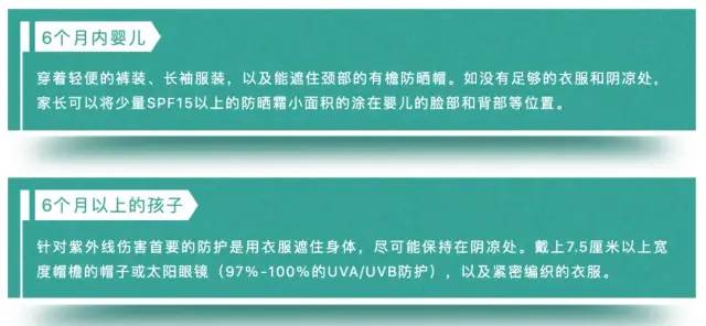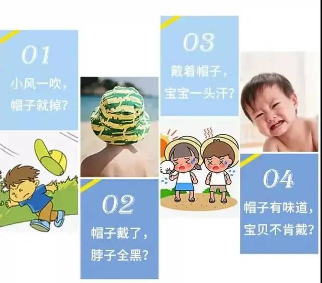 美國(guó)兒科學(xué)會(huì)的建議中,特別提到了能夠遮住頸部有檐的防曬帽,而且對(duì)于6個(gè)月以上的孩子帽椽寬度需要7.5cm以上