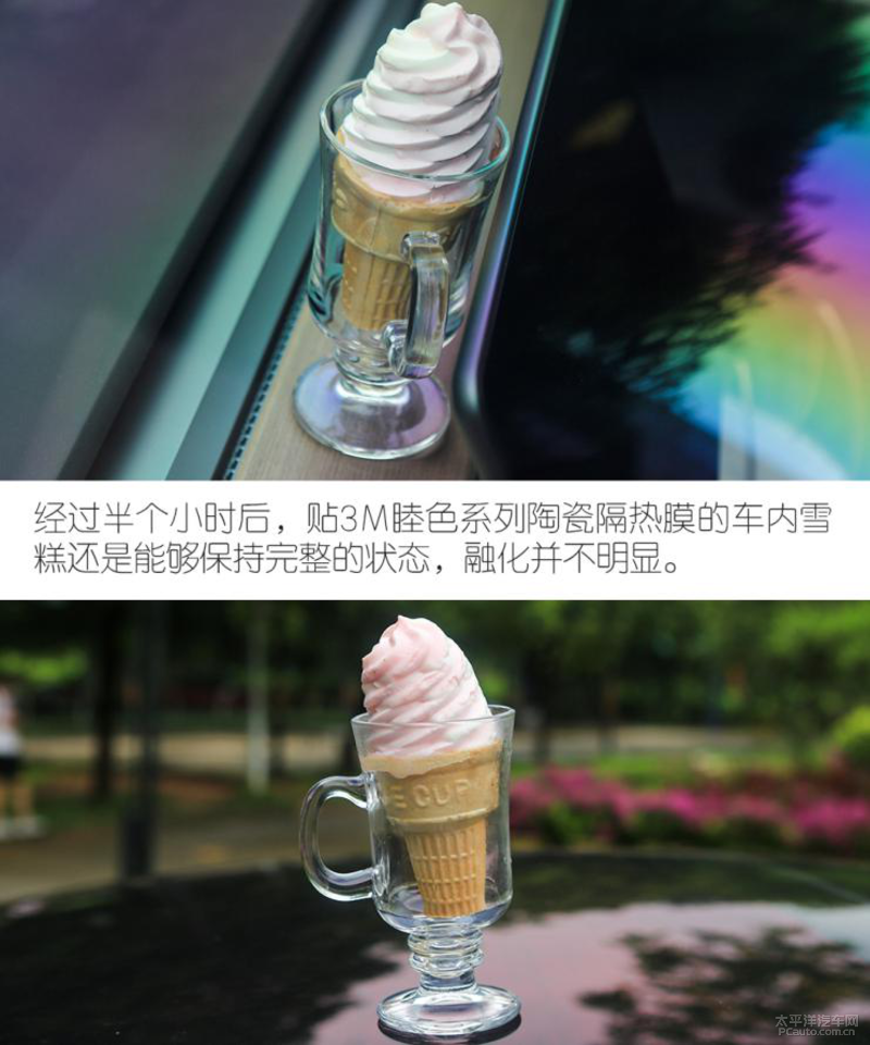 經(jīng)過雪糕融化的測試,直觀感受到貼3M高端納米陶瓷隔熱膜「睦色系列」的車內(nèi)升溫要比普通隔熱膜更慢,說明3M高端納米陶瓷隔熱膜「睦色系列」的隔熱性能更加出色。