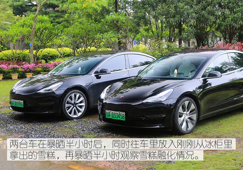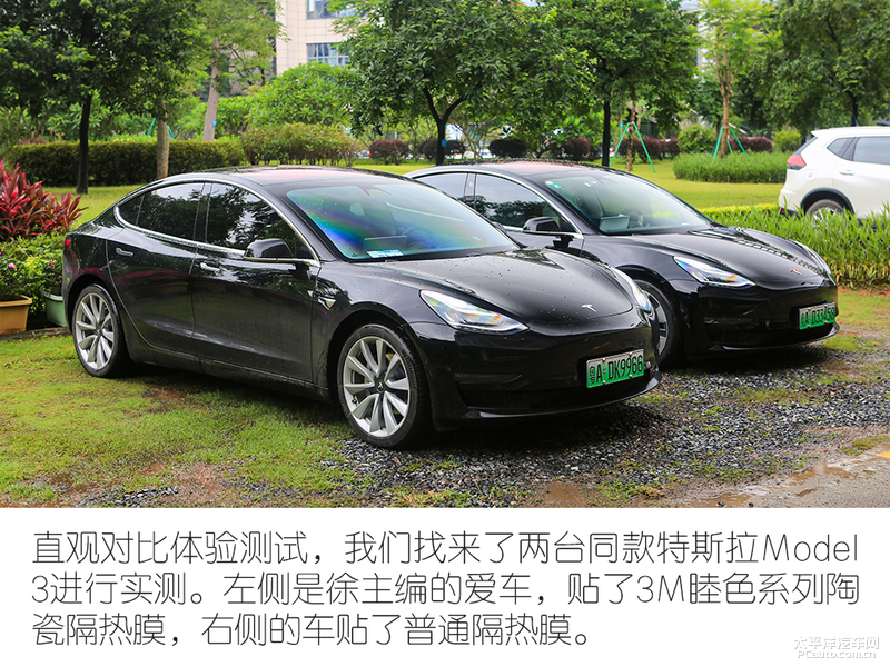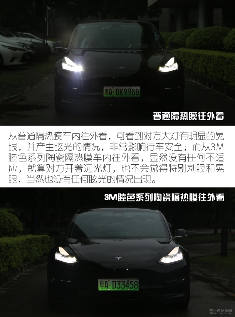 接下來我們就來看看防眩光體驗測試,將會把兩臺特斯拉Model 3相隔3米對向而停,并且開啟遠(yuǎn)光燈照射對方,從而感受體驗前風(fēng)擋隔熱膜對眩光的抑制果。