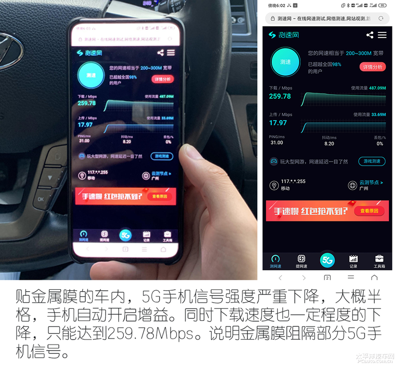 經(jīng)過車內(nèi)打電話、車外藍(lán)牙的連接以及5G信號和下載速度體驗測試,對手機信號有所阻隔。特別是在打電話時,手機自動把發(fā)射功率加大,導(dǎo)致整體電場和磁場數(shù)值有所增加,顯然對人體帶來隱形的危害。3M高端納米陶瓷隔熱膜「睦色系列」表現(xiàn)則比較,三個項目中均難以察覺有任何的信號阻隔,通話清晰、藍(lán)牙連接速度快。