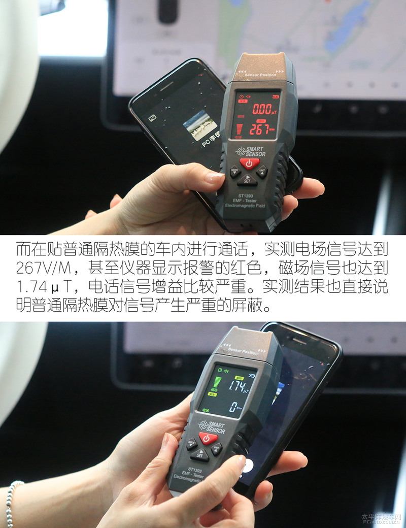 通過客觀數(shù)據(jù)測試,顯然無法身同感受。于是,我們找來了兩臺相同型號的汽車,一輛貼上了3M睦色車膜,另一輛貼的是普通車模,分別在車內(nèi)進(jìn)行信號測試。在貼了3M睦色陶瓷隔熱膜的車?yán)镞M(jìn)行實時通話時的電場數(shù)值是201V/M,磁場數(shù)值也保持在0.37,這與在車外打電話時的信號通暢是一致的。這說明,3M的這款新上市的睦色隔熱膜不會屏蔽信號,能夠讓你隨時保持暢通。