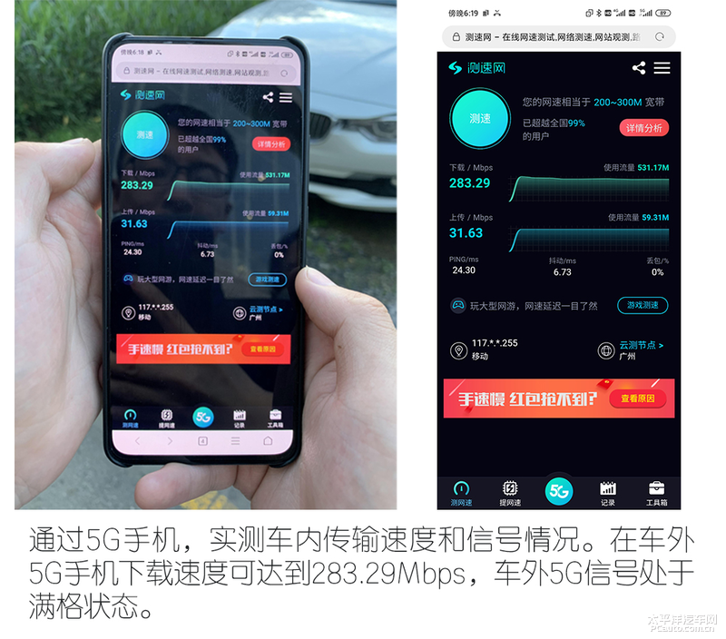 這個環(huán)節(jié)將采用四種的直觀方式進(jìn)行體驗測試,主要為車內(nèi)打電話判斷手機信號增益情況、在車外手機藍(lán)牙連接車機情況、5G手機下載速度情況以及ETC通過的情況。