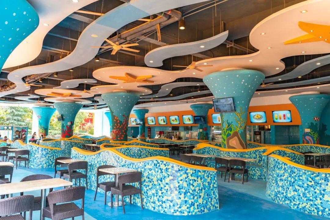 帶娃出門除了考慮怎么玩就是怎么吃了,園區(qū)內(nèi)光是提供正餐的餐廳就有6個,名字童趣,裝修走的是濃濃的海洋風(fēng),而且空間大位置多,價格也不貴。