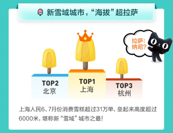 8月1日,線上全國(guó)雪糕消費(fèi)地圖顯示,高線城市一直對(duì)線上升級(jí)市場(chǎng)的接受度較高。上海、浙江、江蘇、廣東、北京五個(gè)地區(qū)牢牢占據(jù)前五,消耗了線上超過(guò)一半的雪糕。在城市方面,上海6、7月份消費(fèi)雪糕超過(guò)31萬(wàn)單,成為城市之,其次是北京、杭州等地。