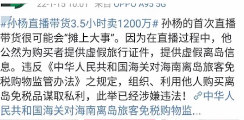 如果孫楊賣的是海南免稅城直發(fā)的離島商品,還為買家提供了虛假的離島信息,那確實(shí)違反了法律法規(guī)。