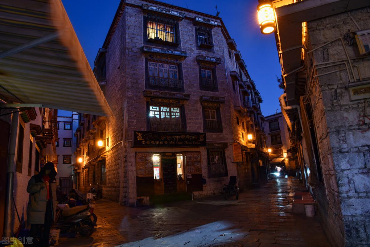 夜晚時分,西藏拉薩八廓街小巷夜景。