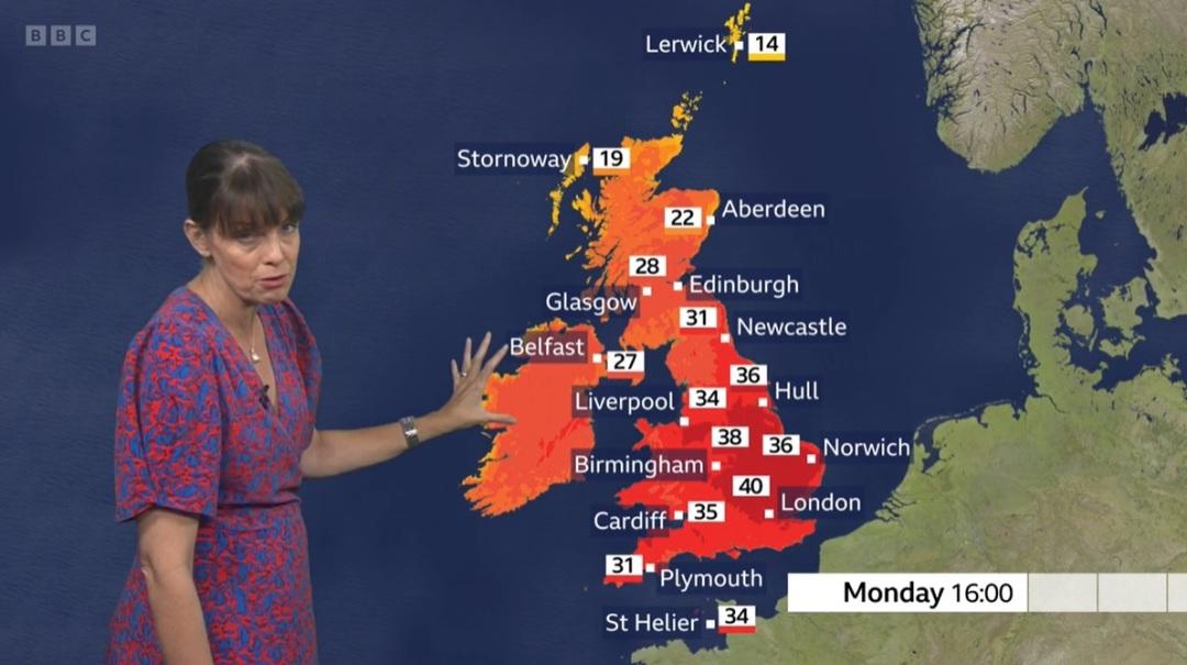 這兩天,英國人看天氣預(yù)報,感覺自己身處地獄中心。整個被炙熱的紅色覆蓋,一半地區(qū)處于“極端高溫”中,英國氣象局預(yù)測,英格蘭將在本周達(dá)到41攝氏度,成為熱的地方之一,比西撒哈拉和加勒比地區(qū)還熱。