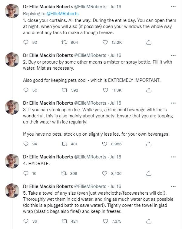 有個自稱“純正澳洲人”的女子專門寫給沒空調(diào)的英國人,轉(zhuǎn)發(fā)量超過1.8萬,成為熱門科普帖:“1,拉好窗簾,一整天都拉著??梢栽谕砩洗蜷_它,然后打開窗,用所有電風(fēng)扇對著窗吹,期待能有一絲涼風(fēng)。2,購買噴霧器,用水灌滿,不停地噴。有助于讓寵物保持涼爽,這很重要。3,囤積冰塊。是的,帶冰的飲料很棒,但它對你的寵物更重要。記得定時在它們的水里加冰塊!如果沒有寵物,那少囤一點冰,給自己做冷飲。4,補充水分。……”