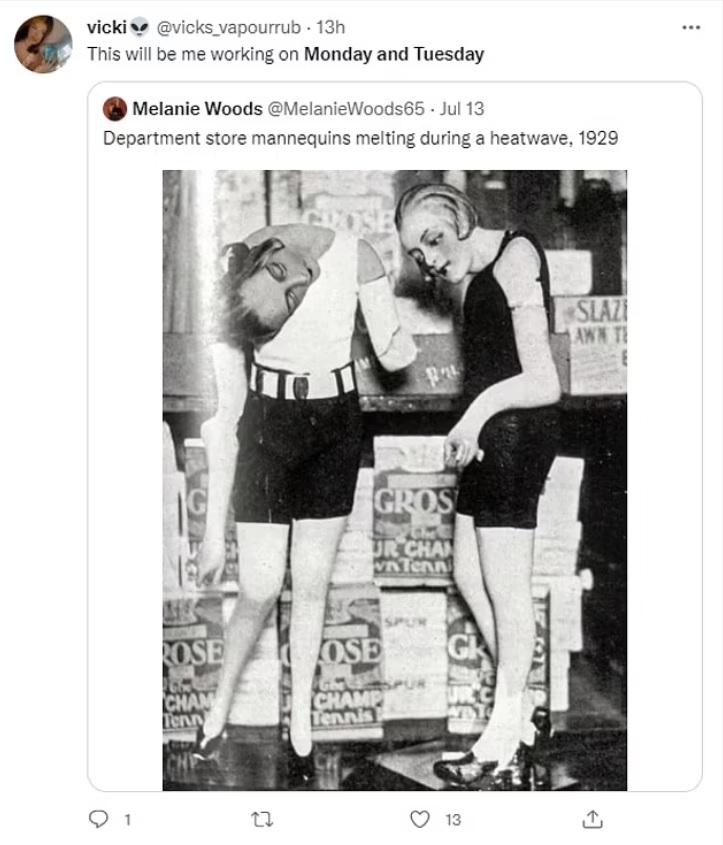 “ ‘櫥窗里的模特人偶在熱浪中化了,1929’我猜周一周二上班的時候,我也會變成這樣。”