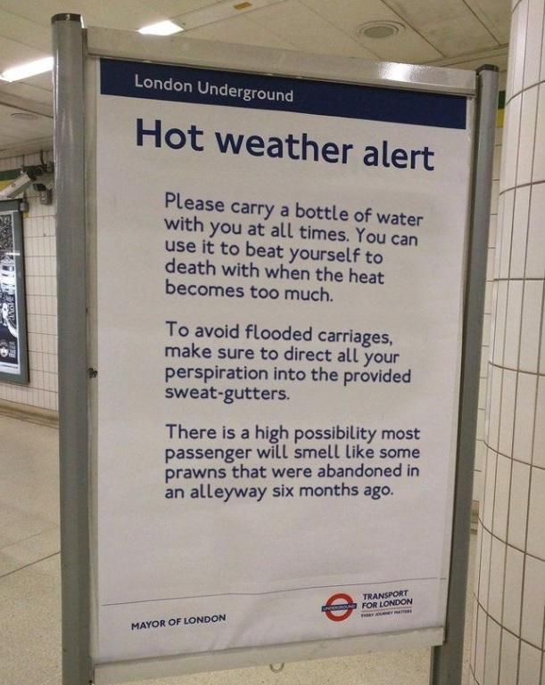 倫敦地鐵還發(fā)了一個畫風(fēng)別致的高溫警告:“請隨身攜帶一瓶水。實在熱得受不了,你還可以用它把自己打死。如果不想在車廂里被淹死,請你的汗水都排到排汗槽里。(注:并沒有這樣的東西)走進(jìn)車廂,很可能絕大部分乘客聞起來就像六個月前丟在小巷子里的臭蝦。”
