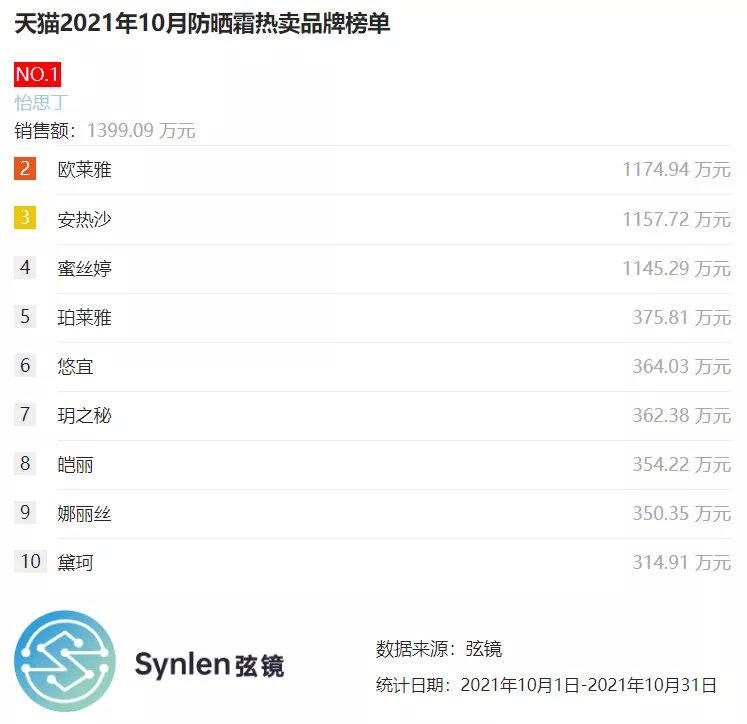 根據(jù)電商數(shù)據(jù)搜索工具——“弦鏡”數(shù)據(jù)顯示,天貓平臺(tái)10月防曬霜熱賣(mài)品牌榜單,第一名怡思丁,銷(xiāo)售額為1399.09萬(wàn)元。第二名歐萊雅,銷(xiāo)售額為1174.94萬(wàn)元。第三名安熱沙,銷(xiāo)售額為1157.72萬(wàn)元。從第四名到第十名分別為蜜絲婷、珀萊雅、悠宜、玥之秘、皚麗、娜麗絲、黛珂。