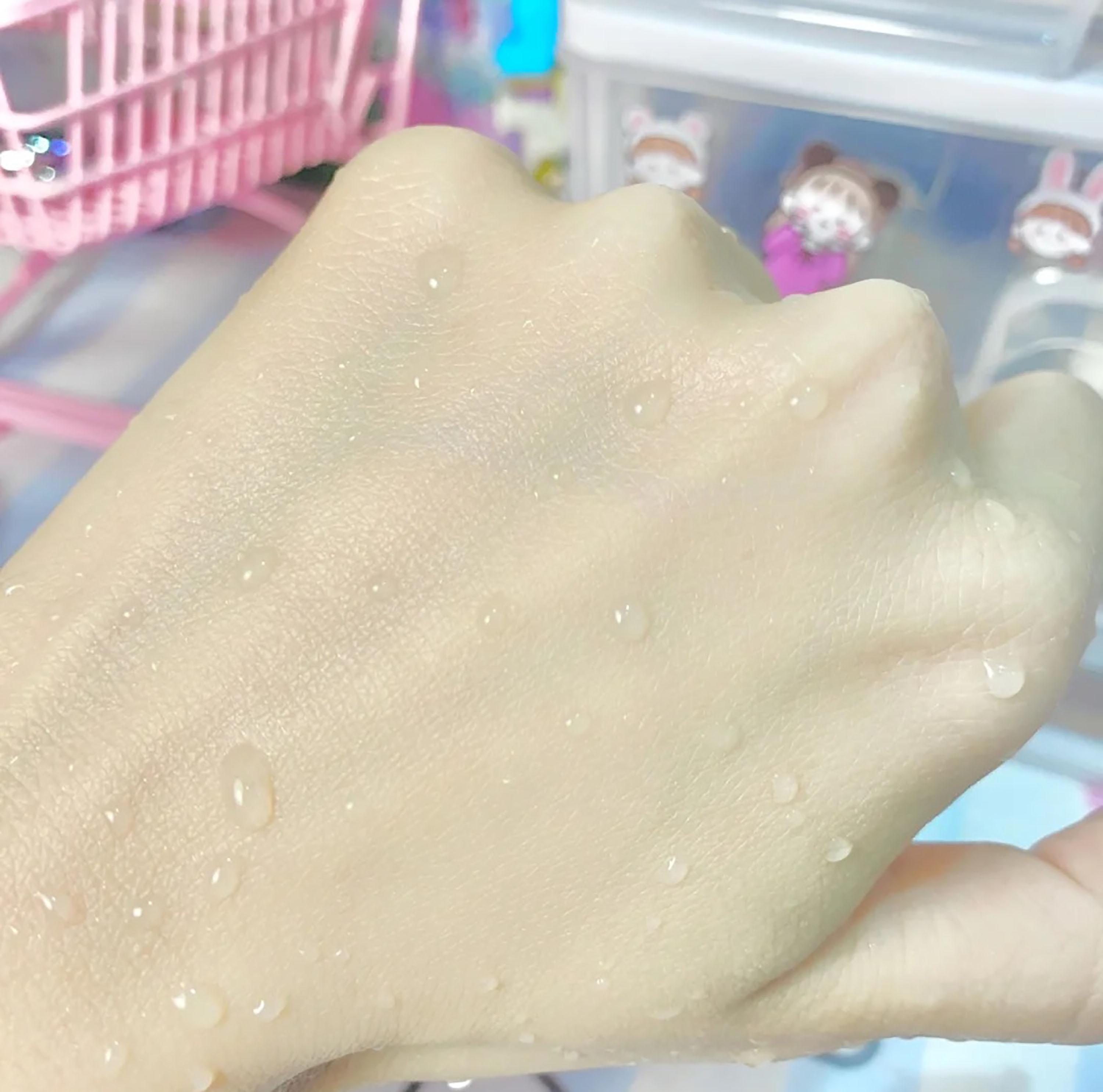 質(zhì)地是很清透的牛奶質(zhì)地,推開后還會爆水珠,的水潤好推開。成膜的速度很快,清爽不粘膩,是很自然的膜感,透氣不悶。