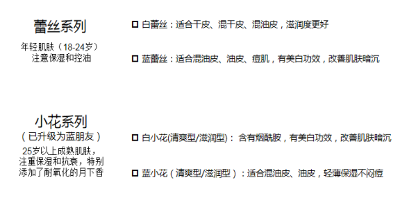 蘇菲娜分臺(tái)版和日版,日本的成分和使用感受都比臺(tái)灣好不少,當(dāng)然價(jià)格也貴不少。蕾絲系列和小花系列的區(qū)別我做了張圖:
