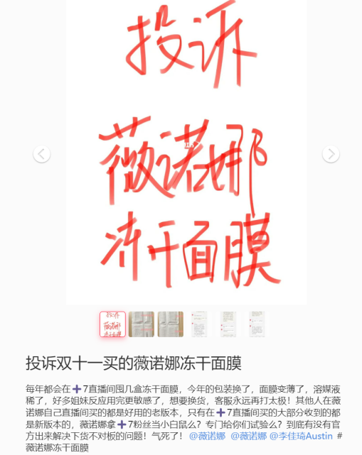 在小紅書平臺上不少網(wǎng)友稱,今年雙11在李佳琦直播間入手的“薇諾娜舒緩修護凍干面膜”與薇諾娜旗艦店的同款面膜,包裝有所差別,以及李佳琦直播間展示的面膜樣板,與實際收到貨的面膜包裝不同,貨不對板。還有多位網(wǎng)友稱,使用了該款面膜后出現(xiàn)了發(fā)紅發(fā)癢、過敏等現(xiàn)象。“薇諾娜拿粉絲當(dāng)小白鼠么?”