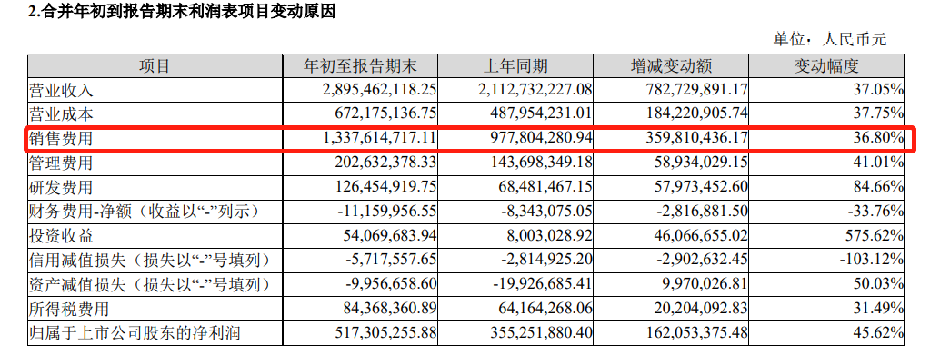 三季度財報顯示,貝泰妮前三季度累計銷售費用13.4億元,同比增長36.8%;累計銷售費用率為46.2%,也就是說,如果產(chǎn)品賣100塊錢,其中有將近一半的錢要用來做營銷。