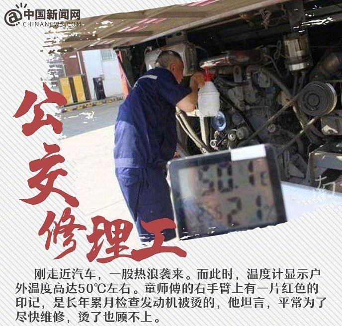 剛走進汽車,一股熱浪來襲。而此時,溫度計顯示戶外溫度高達50℃左右。童師傅的右手臂上有一片紅色的印跡,是長年累月檢查發(fā)動機被燙傷的,他坦言,平常為了盡快維修,燙了也顧不上。