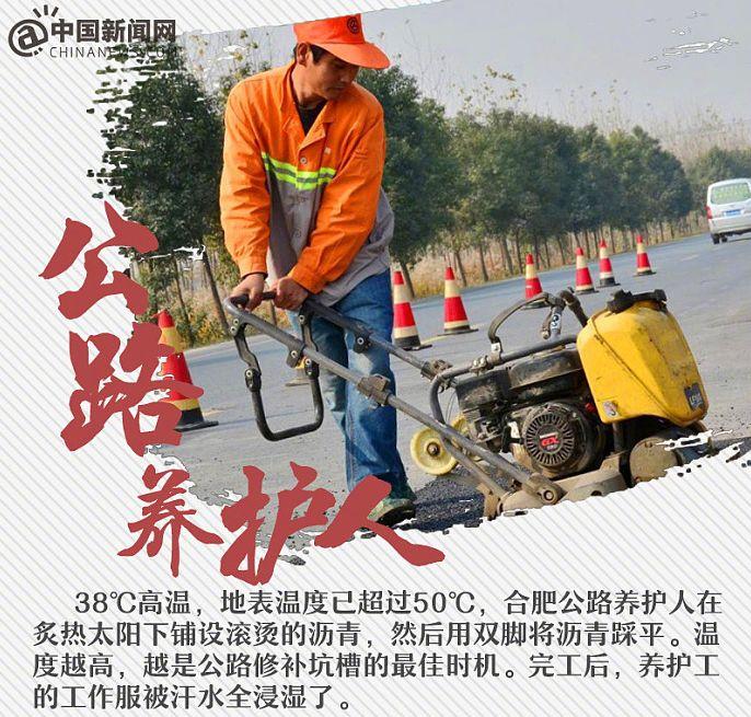 38℃高溫,地表溫度已經(jīng)超過50℃,合肥公路養(yǎng)護人在炙熱太陽下鋪設(shè)滾燙的瀝青,然后用雙腳將瀝青踩平。溫度越高,越是公路修補坑槽的佳時機。完工后,養(yǎng)護工的工作服被汗水全浸濕了。