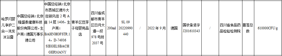 2020年9月10日,藥監(jiān)局發(fā)布《關(guān)于7批次不合格化妝品的通告(2020年第60號)》,哈羅閃嬰兒凈護(hù)二合一洗發(fā)沐浴露菌落總數(shù)超標(biāo)。