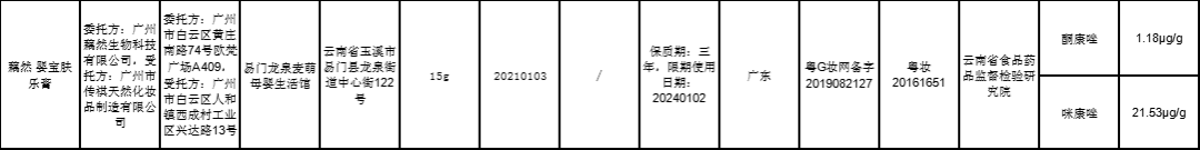 2022年2月21日,標(biāo)示委托方為廣州藕然生物科技有限公司,受托方為廣州市傳祺天然化妝品制造有限公司的藕然嬰寶膚樂膏,檢出了酮康唑、咪康唑兩種化妝品禁用組分。