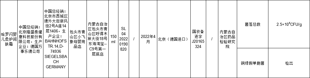 2022年2月17日,藥監(jiān)局發(fā)布關(guān)于50批次不符合規(guī)定化妝品的通告,通告顯示哈羅閃嬰兒柔護(hù)潤膚霜菌落總數(shù)不合格,被檢出含有銅綠假單胞菌。