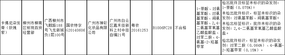 問題項(xiàng)目:未檢出批件標(biāo)識,標(biāo)簽未標(biāo)識的染發(fā)劑:對氨基苯酚、間氨基苯酚;