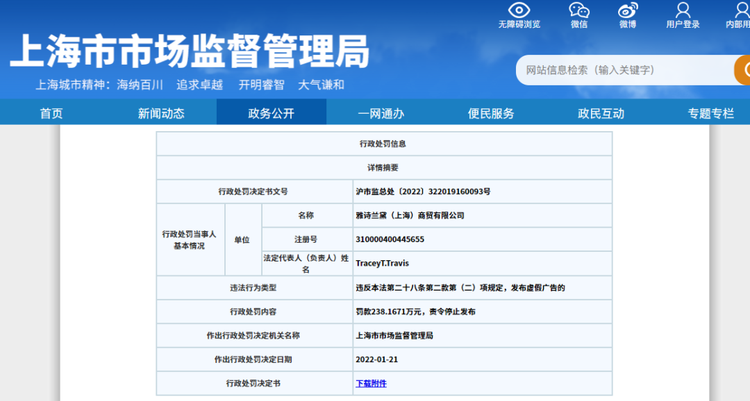 2022年1月21日,上海市市場監(jiān)督管理局發(fā)布了一則行政處罰信息,雅詩蘭黛(上海)商貿(mào)有限公司因通過多個(gè)渠道發(fā)布虛假廣告內(nèi)容被罰238萬元。